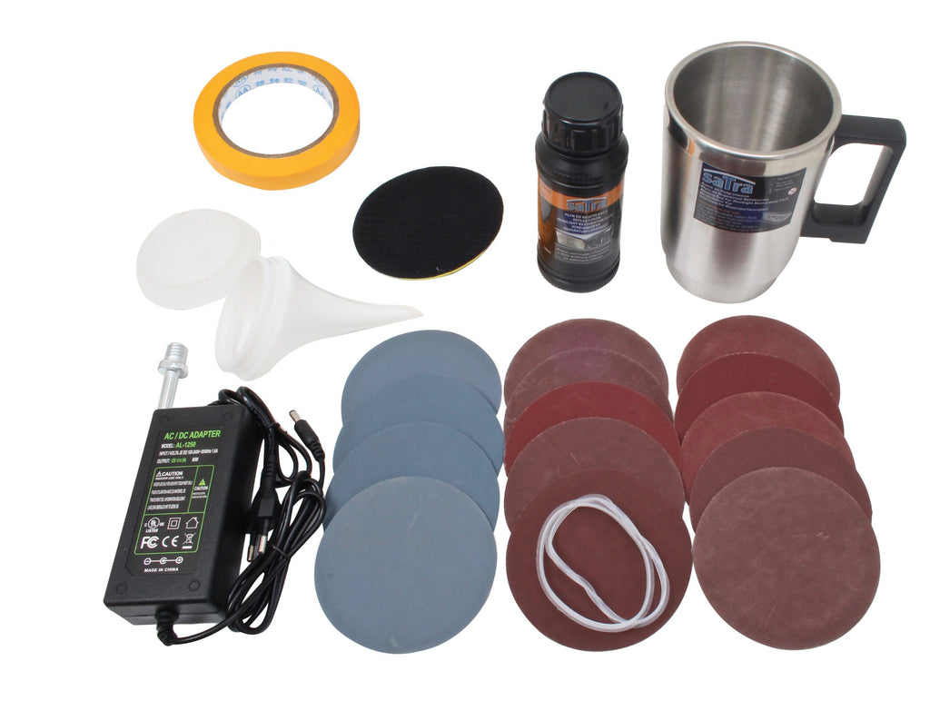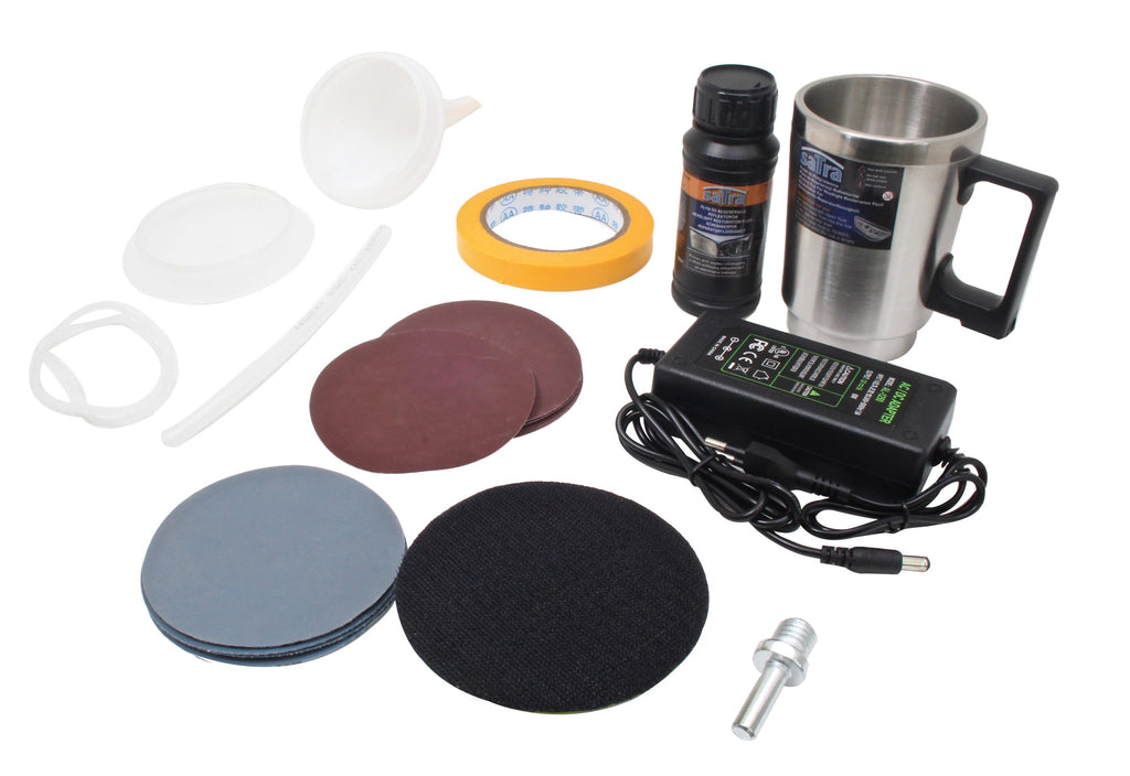 Sada obsahuje brúsne kotúče P800, P1000, P1200, P1500, P2000, P2500 a P3000 (po dva kusy z každého typu), fľašu so 100 ml renovačnej kvapaliny, nádobku na aplikáciu kvapaliny, plastové viečko na nádobku, dve tesnenia pre nádobku, napájací zdroj 230 V, leštiacu hubku so suchým zipsom, adaptér so závitom M10 a viečko s pružnou hadičkou.