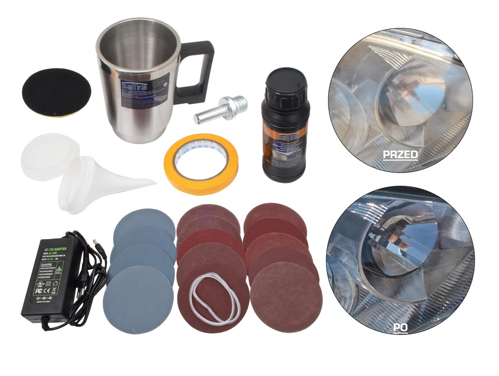 Táto SADA NA RENOVÁCIU SVETLOMETOV S POLYMÉROM 23 KS SATRA je určená na obnovu plastových svetlometov automobilov. Využíva technológiu odparovania špeciálnej kvapaliny, ktorá sa vo forme pary usádza na povrchu svetlometu a obnovuje vrchnú vrstvu polykarbonátu. Tento proces odstraňuje škvrny, škrabance, stopy oxidácie a vyblednutie, čím obnovuje plnú priehľadnosť šošovky.