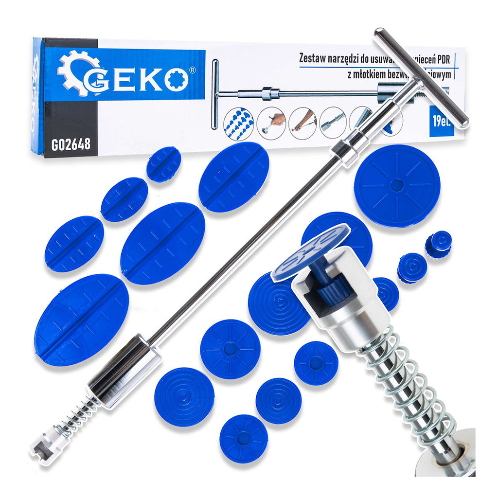 SADA NA VYROVNÁVANIE PRELIAČIN PO KRUPOBITÍ GEKO je určená na opravu drobných poškodení karosérií vozidiel bez nutnosti lakovania. Nástroj využíva klzné reverzné kladivo, ktoré umožňuje kontrolované vytiahnutie povrchu späť do pôvodného tvaru. Adaptéry sú šetrné k laku a na povrchu nezanechávajú stopy.