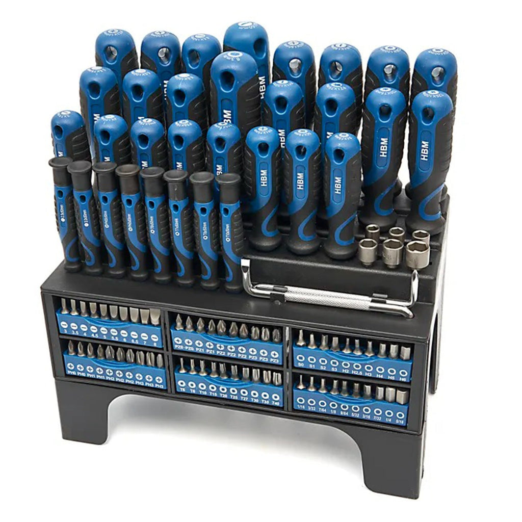 Táto SADA 100 KS: SKRUTKOVAČE, BITY, NASADACIE KĽÚČE, RACK DRŽIAK, CRV OCEĽ, SOFT GRIP RUKOVÄŤ, HBM HOLANDSKO obsahuje širokú škálu skrutkovačov, bitov, nasadacích kľúčov a račňového skrutkovača, všetko efektívne usporiadané v rack držiaku, ktorý je ľahko prístupný a skladovateľný. Všetky diely sú vyrobené z vysoko kvalitnej Cr-V ocele, čo poskytuje zvýšenú odolnosť proti opotrebeniu a dlhú životnosť. Ergonomické rukoväte s povrchom soft grip zabezpečujú pohodlie a optimálnu kontrolu pri používaní, aj pri dlhodobej práci.