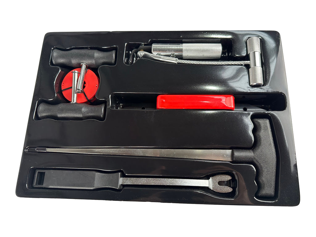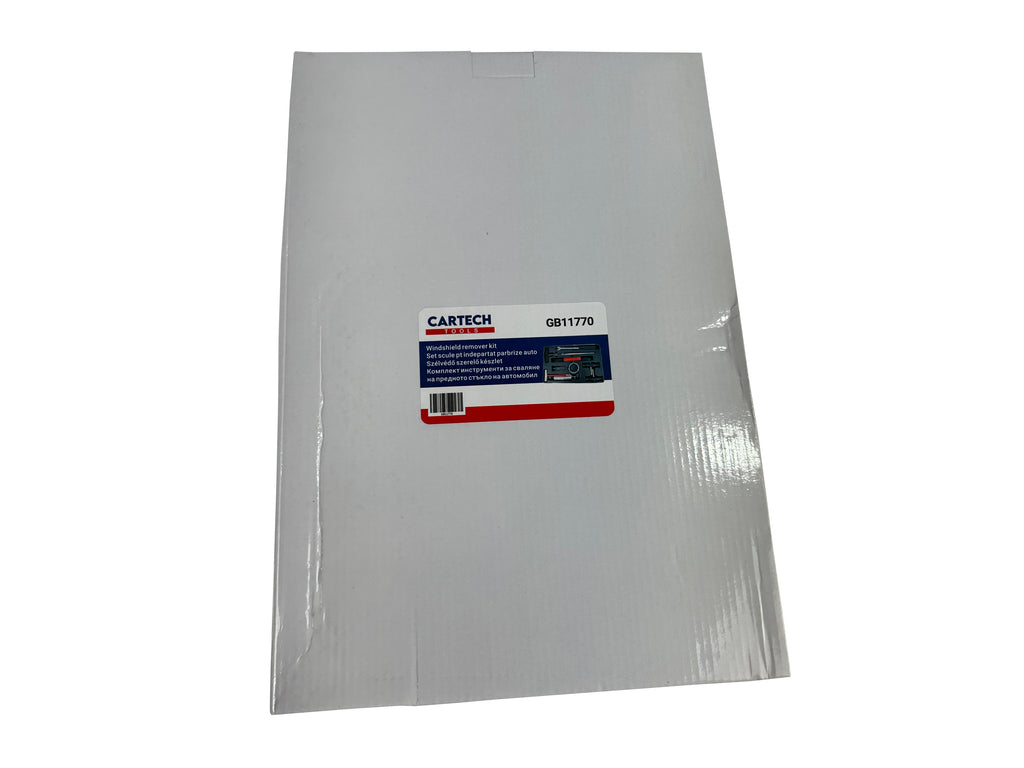 TÁTO SADA NÁRADIA NA ODSTRÁNENIE ČELNÝCH SKIEL AUTA GEBO TOOLS je ideálna na jednoduchú demontáž čelných skiel. Sada obsahuje zariadenie na odstránenie tesnení a plastových klipov, hákový nástroj na upevnenie tesnení a gumových líšt, nástroj s čepeľou v uhle 90 stupňov na rezanie silikónu čelných skiel, dve zariadenia na drôt na rezanie silikónu čelných skiel, nástroj na zavedenie rezacieho drôtu a cievku s oceľovým drôtom na rezanie.