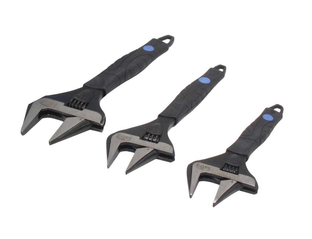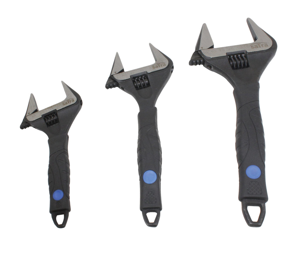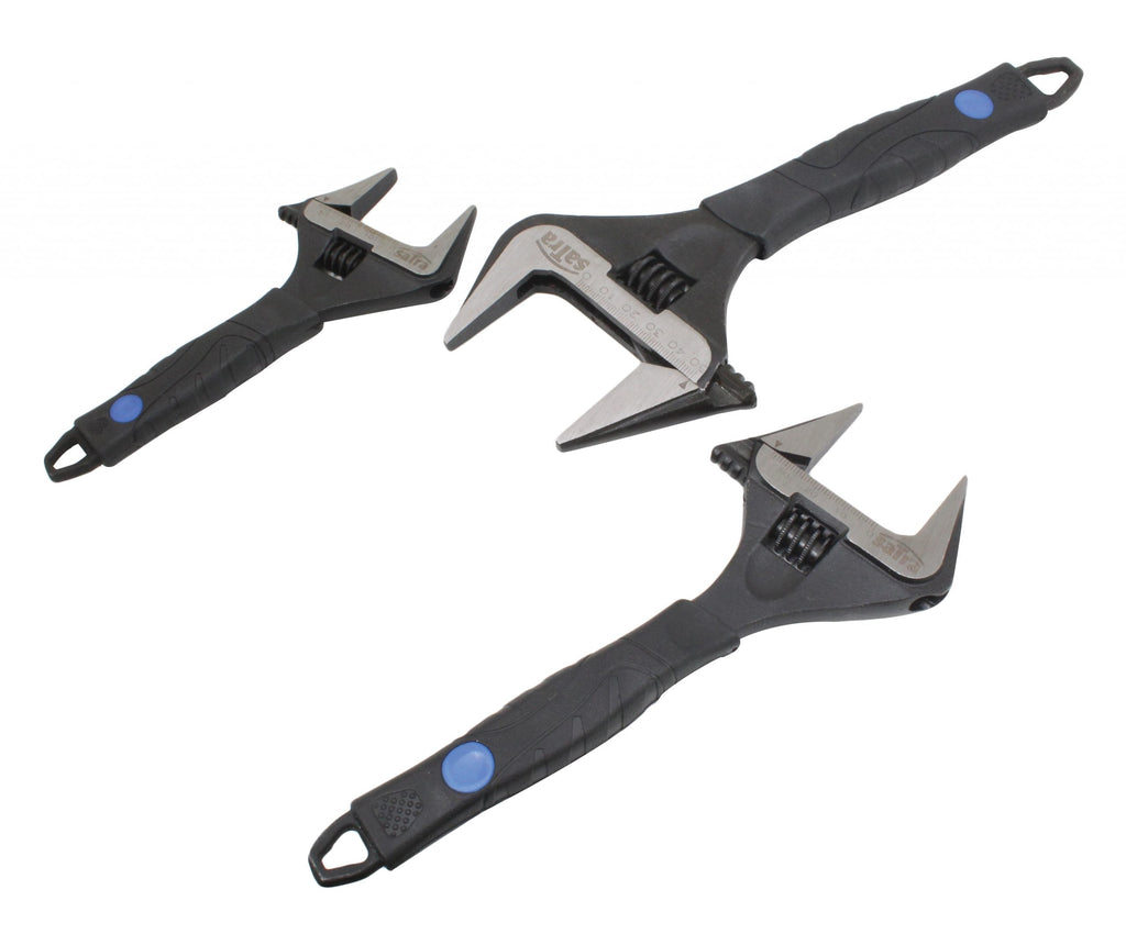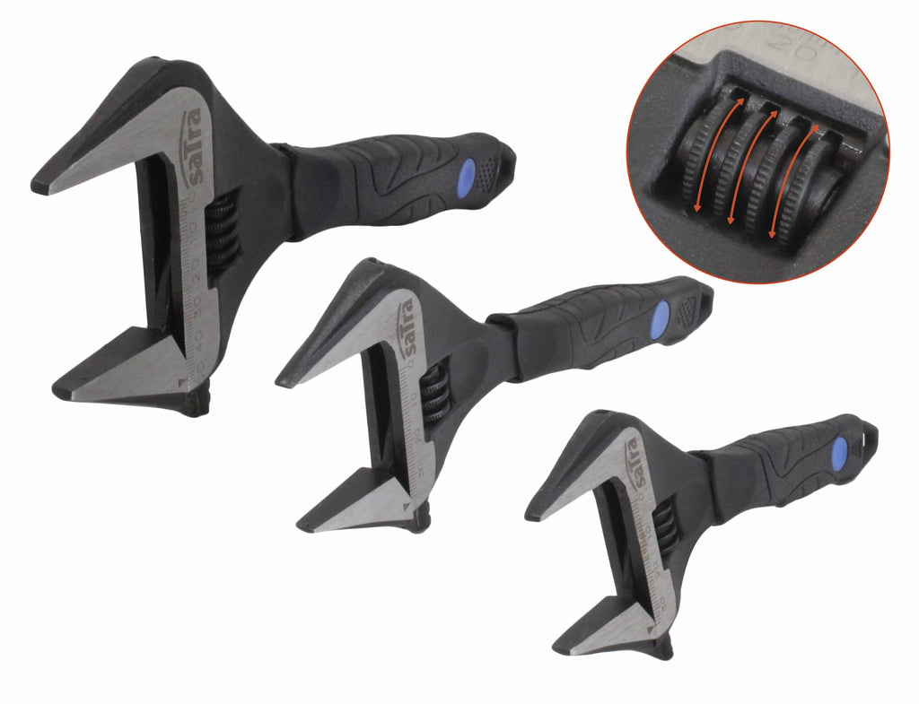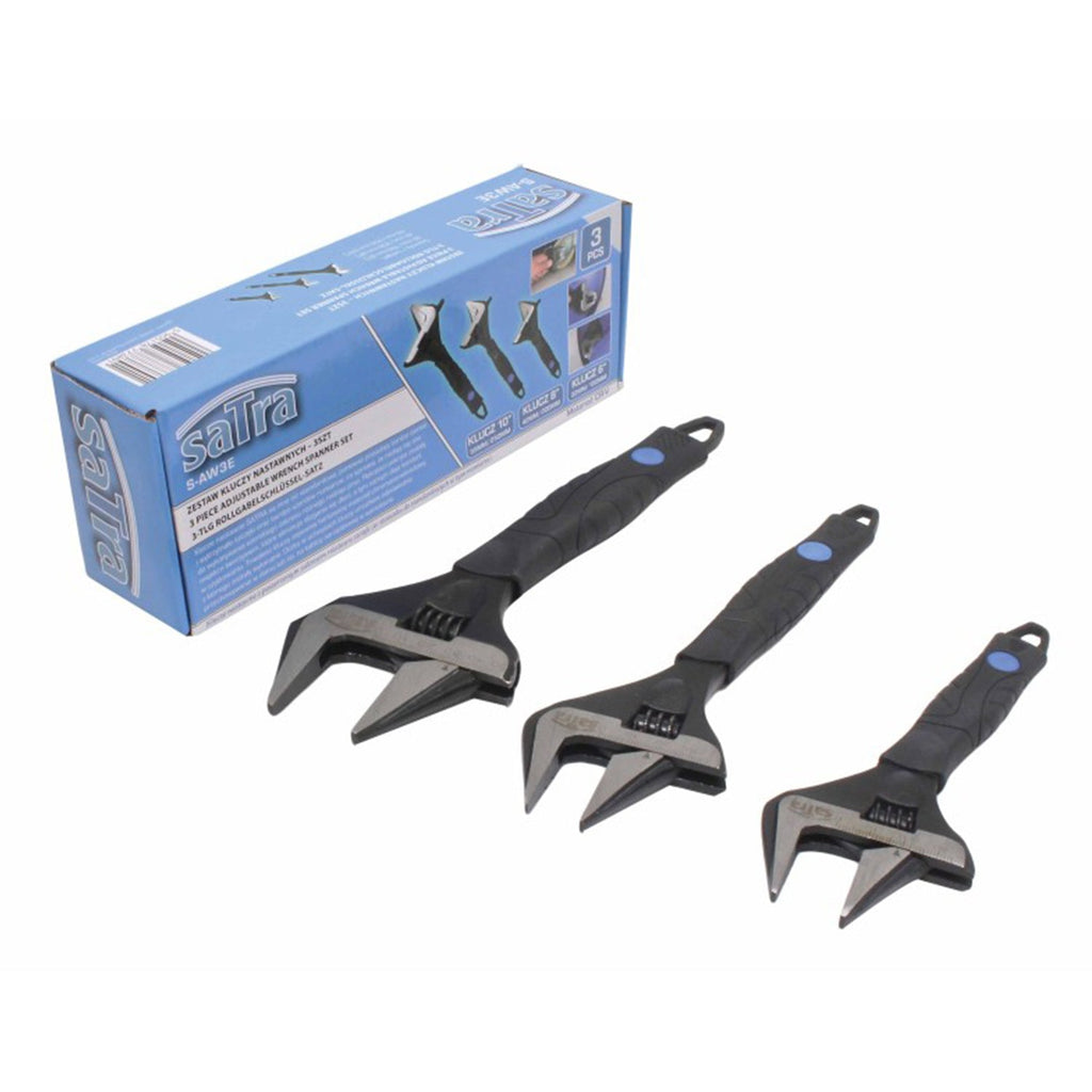 TÁTO SADA NASTAVITEĽNÝCH KĽÚČOV 3 KS SATRA obsahuje prvky vyrobené z Cr-V ocele. Veľkosti sú od 32 mm pri dĺžke 150 mm (6”), od 42 mm pri dĺžke 200 mm (8”) a od 55 mm pri dĺžke 250 mm (10”).