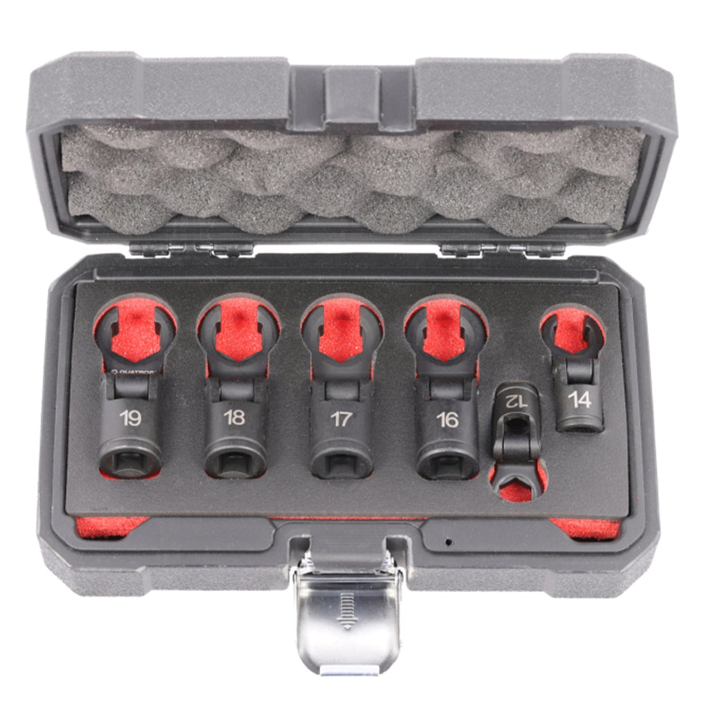 TÁTO SADA RÚROVÝCH KĽÚČOV S KĹBOM 3/8 NA BRZDOVÉ POTRUBIA 6 KUSOV obsahuje veľkosti od 12 do 19 mm. Flexibilný kĺb umožňuje používanie kľúčov na ťažko prístupných miestach.