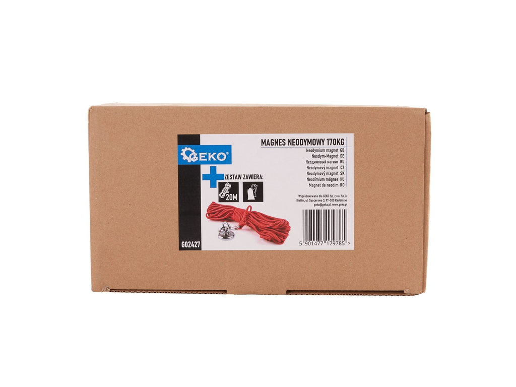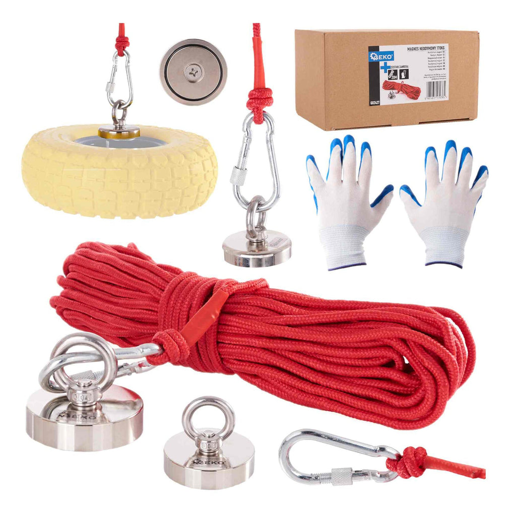 TÁTO SADA NEODYMOVÝ MAGNET 170KG S LANOM 20M A RUKAVICAMI s prídržnou silou 170 kilogramov, vybavená 20-metrovým lanom a rukavicami, je súprava používaná na vyťahovanie kovových predmetov z vody alebo iných neprístupných miest. Neodymový magnet je mimoriadne silný a schopný pritiahnuť malé alebo stredne veľké kovové predmety z rôznych prostredí, vrátane vody alebo pôdy.