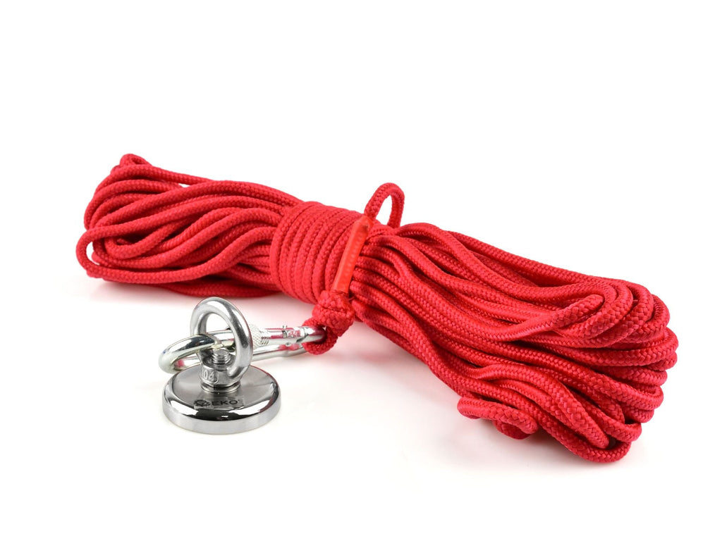 TÁTO SADA NEODYMOVÝ MAGNET 50KG S LANOM 20M A RUKAVICAMI s prídržnou silou 50 kilogramov, vybavená 20-metrovým lanom a rukavicami, je súprava používaná na vyťahovanie kovových predmetov z vody alebo iných neprístupných miest. Neodymový magnet je mimoriadne silný a schopný pritiahnuť malé alebo stredne veľké kovové predmety z rôznych prostredí, vrátane vody alebo pôdy.
