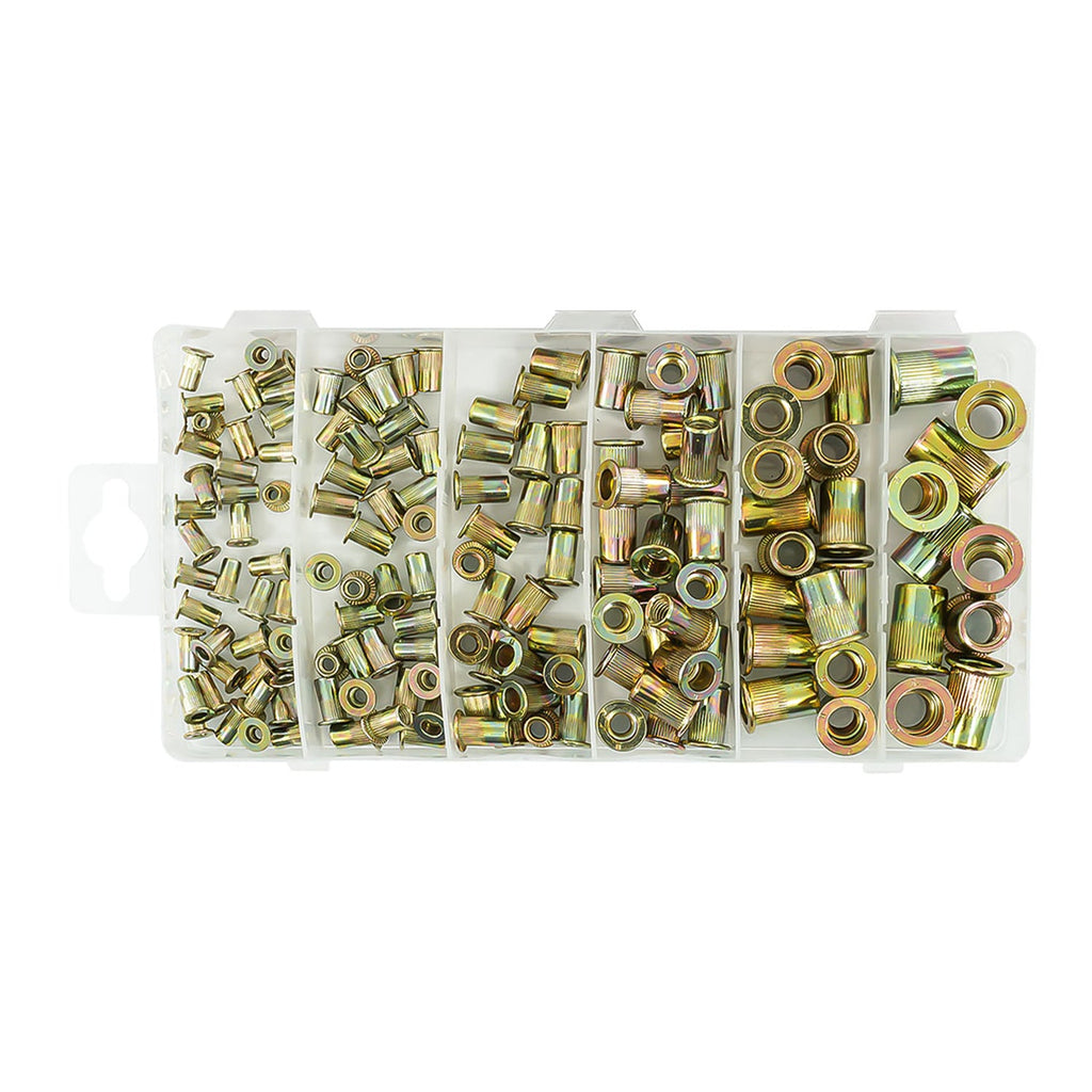 TÁTO SADA NITOVACÍCH MATÍC M3–M10, 150 KUSOV obsahuje prvky, ktoré umožňujú upevnenie skrutky alebo čapu s metrickým závitom do plechu alebo iných materiálov. Sada obsahuje nitovacie matice z ocele a hliníka v tomto rozložení: M3 – 40 kusov, M4 – 35 kusov, M5 – 25 kusov, M6 – 25 kusov, M8 – 15 kusov, M10 – 10 kusov. Nitovacie matice majú valcovú prírubu so zúbkovaním.