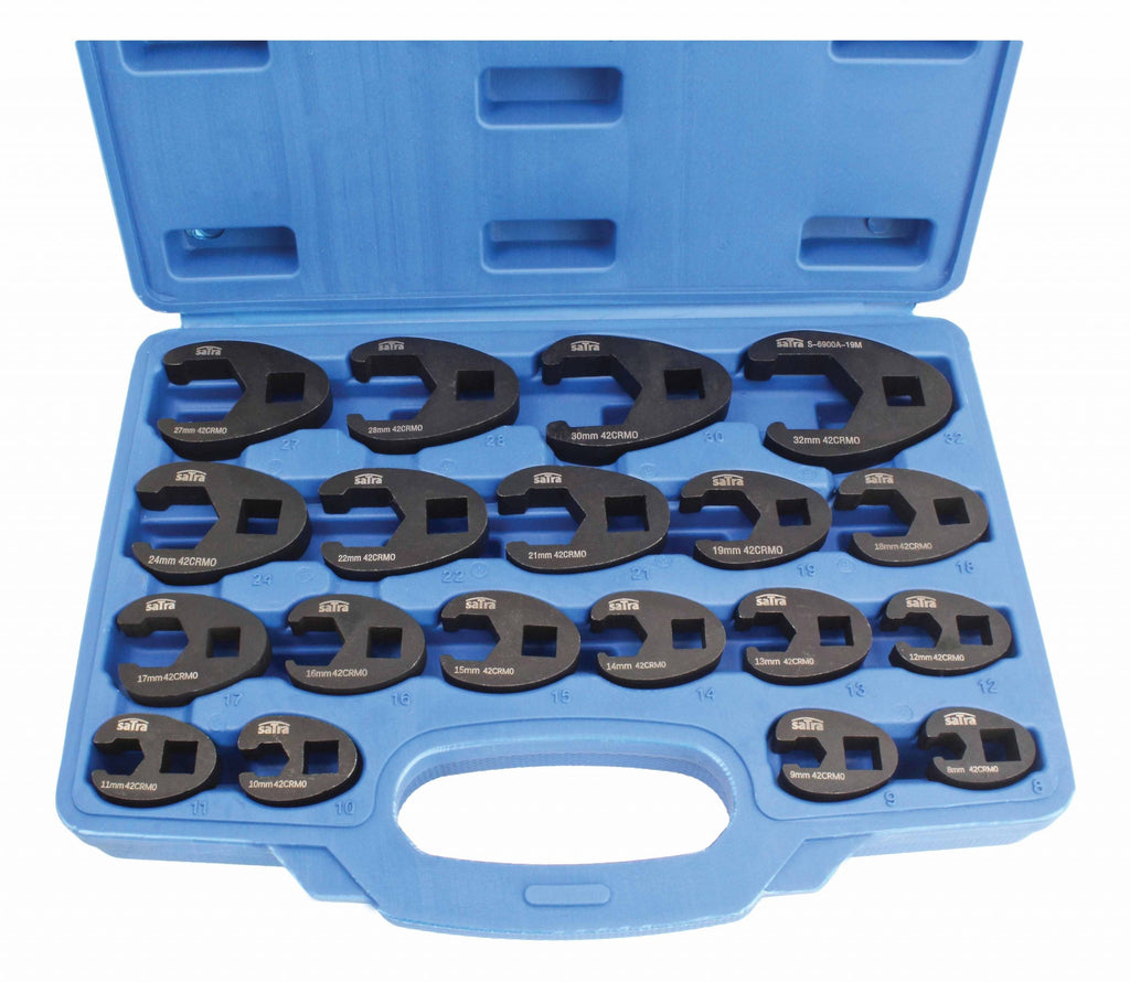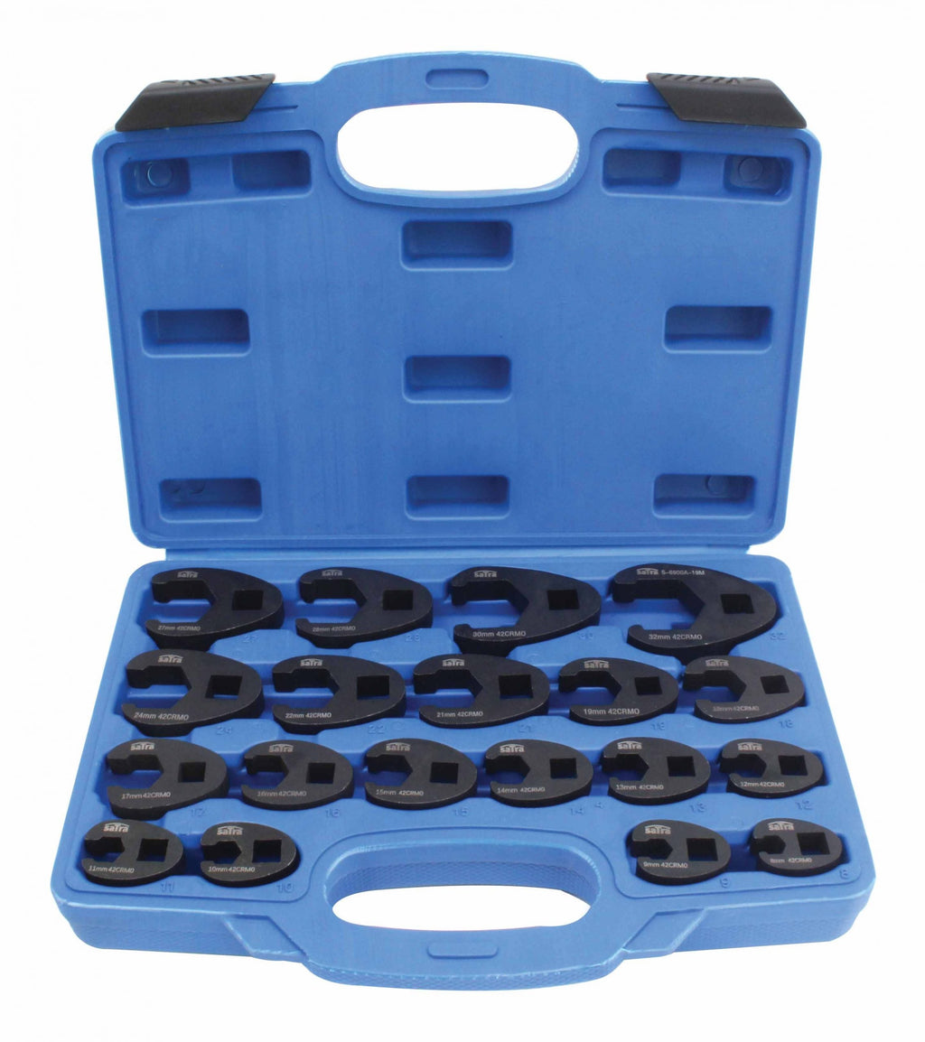 TÁTO SADA POLOOTVORENÝCH KĽÚČOV NA BRZDOVÉ A PALIVOVÉ POTRUBIA, 8-32 MM, 19 KUSOV SATRA je vyrobená z chróm-molybdénovej ocele. Sú ideálne na brzdové alebo hydraulické potrubia a všade tam, kde sa dá použiť bežný kľúč, ale sú kompatibilné aj s niektorými račňovými kľúčmi s veľkosťou unášača 3/8″ alebo 1/2″. Často sa tieto kľúče používajú na brzdové alebo hydraulické potrubia, stavebné stroje, autoservis, priemysel alebo poľnohospodárstvo. Veľkosti zahrnuté v sade sa pohybujú od 8 do 19 mm pre kľúče s pripojením 3/8”. Pre kľúče 1/2” od 21 do 32 mm.