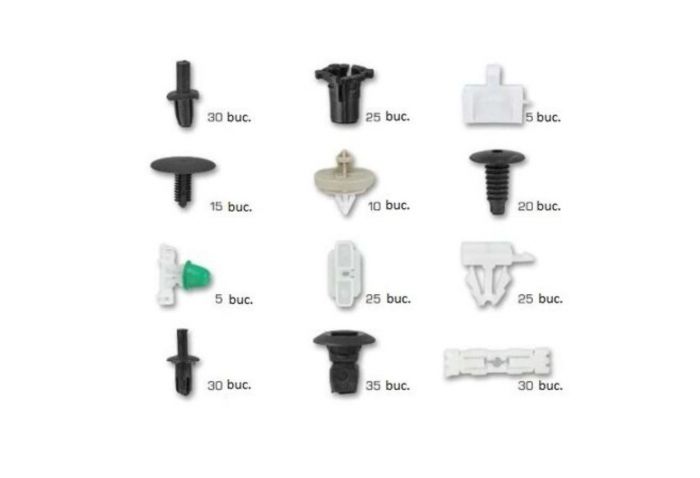 SÚPRAVA PLASTOVÝCH KLIPOV A SVORIEK PRE VOLKSWAGEN, 255 KS, obsahuje rôzne veľkosti a typy upevňovacích prvkov určených na vnútorné aj vonkajšie použitie v automobiloch. Klipy a svorky sú ideálne na opravu čalúnenia, stropov, výplní dverí, upevnenie podbehov kolies alebo rôznych ozdobných líšt.