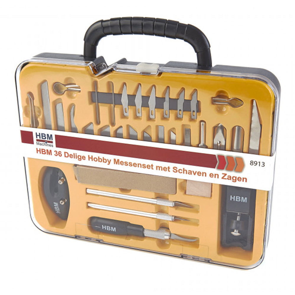 TÁTO SADA PRESNÝCH REZAČIEK NA REZANIE A REZBÁRSTVO 36 KUSOV HBM obsahuje 3 rukoväte rôznych veľkostí, 26 vymeniteľných nadstavcov (čepele, ihly, dláta, píly), 3 pinzety, 2 hoblíky a 2 brúsne kamene. Krabica je vybavená magnetickými pásikmi pre bezpečné uloženie.