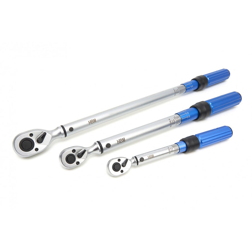 TÁTO SADA PROFESIONÁLNYCH MOMENTOVÝCH KĽÚČOV 5 - 330Nm 3 KS HBM obsahuje momentové kľúče s rozmermi 1/2”, 1/4” a 3/8”. Pracovný rozsah pre jednotlivé kľúče je 5-25 Nm, 20-120 Nm a 60-330 Nm. Všetky tri kľúče sú vyrobené z ocele. Sú ideálne na uťahovanie rôznych skrutiek a matíc na ťažko dostupných miestach.