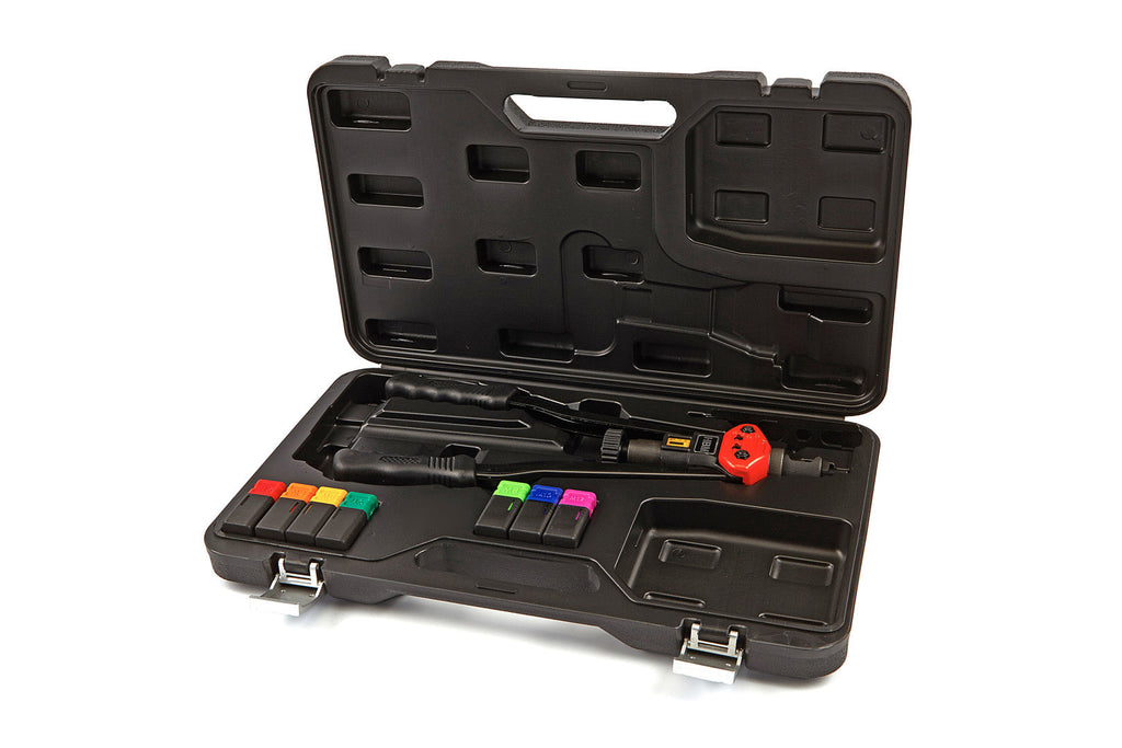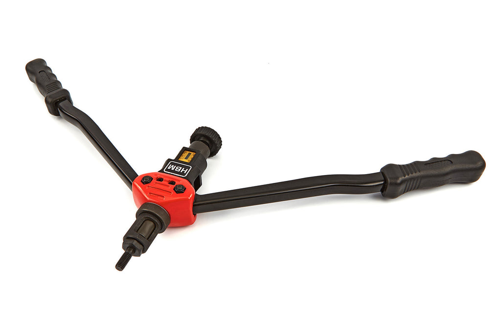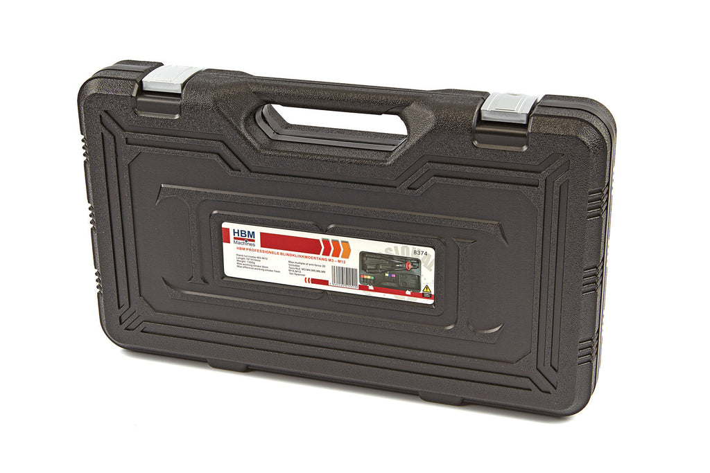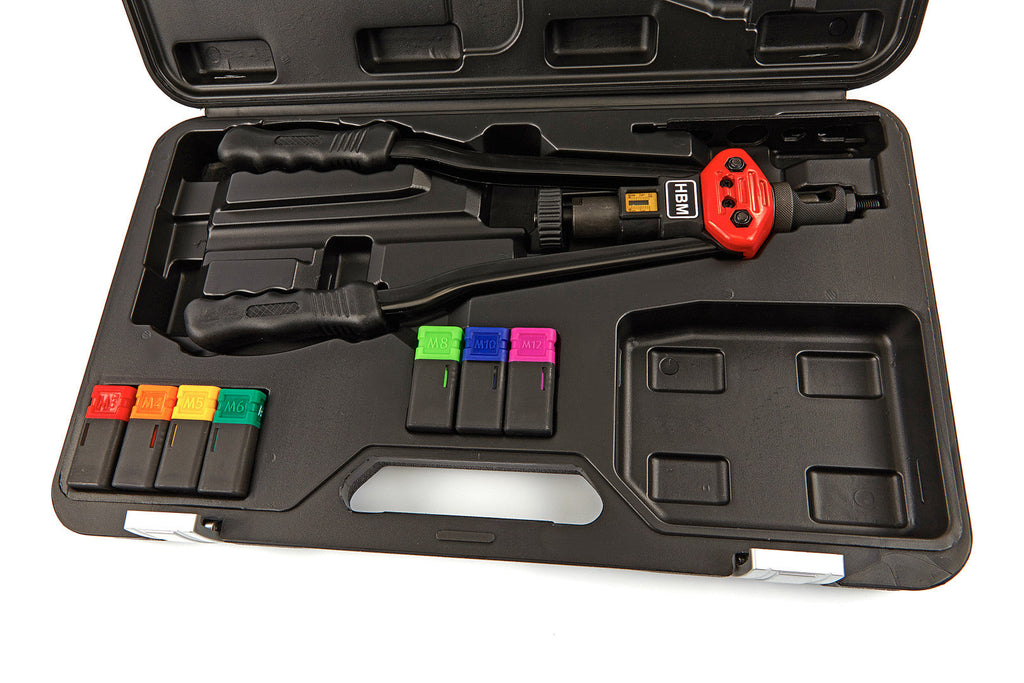 TÁTO PROFESIONÁLNA SADA KLIEŠTÍ NA NITOVANIE M3-M12 HBM je vhodná pre matice z ocele a hliníka. Sada obsahuje montážny kľúč a 6 vymeniteľných nadstavcov pre rôzne veľkosti nitovacích matíc.