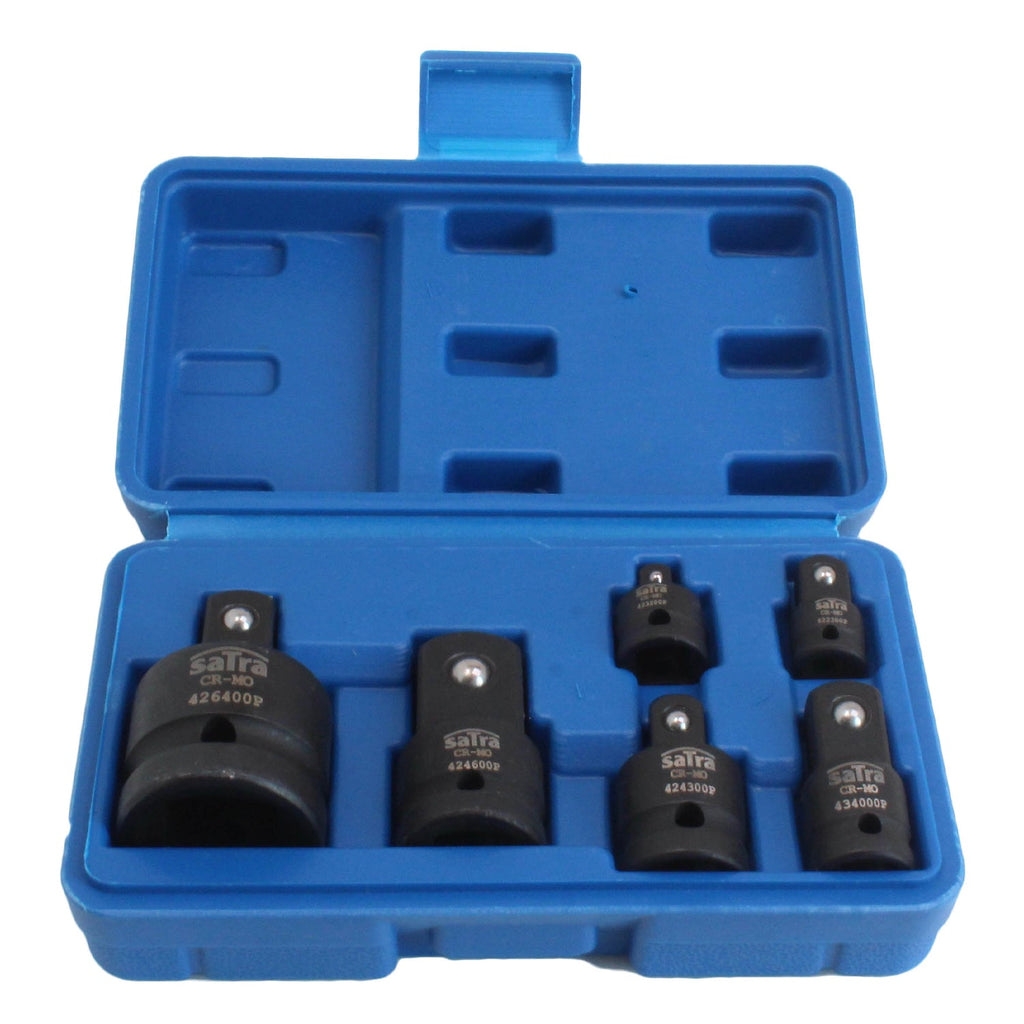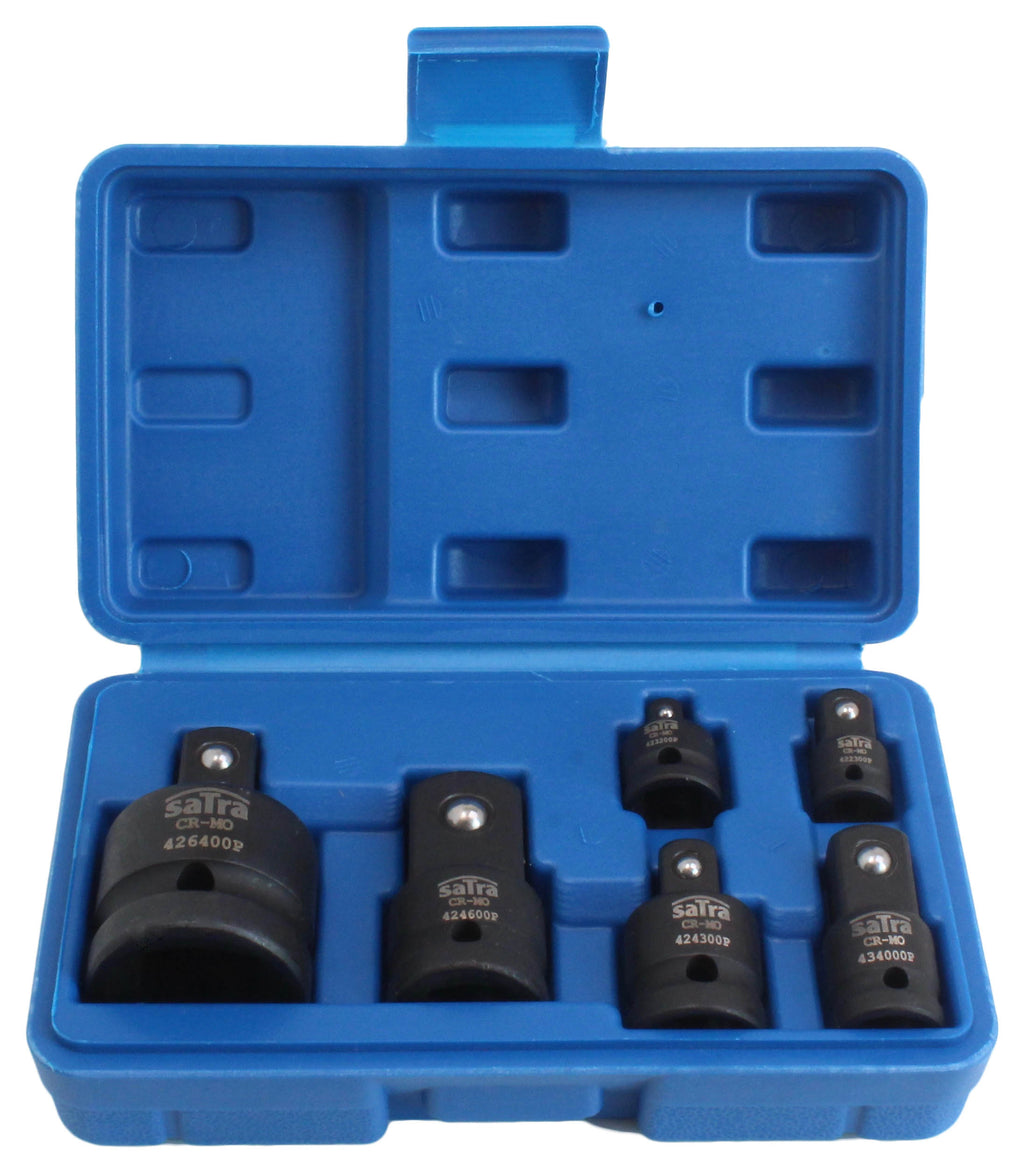 SÚPRAVA RÁZOVÝCH ADAPTÉROV 6 KS SATRA je vyrobená z vysoko odolnej ocele Cr-Mo, ktorá zaručuje dlhú životnosť a spoľahlivosť aj pri náročnom profesionálnom použití. Adaptéry umožňujú jednoduchú zmenu veľkosti štvorhranu — z väčšieho na menší a naopak. Sú ideálne pre prácu s pneumatickými a elektrickými rázovými uťahovačkami v dielni alebo priemyselnej výrobe.