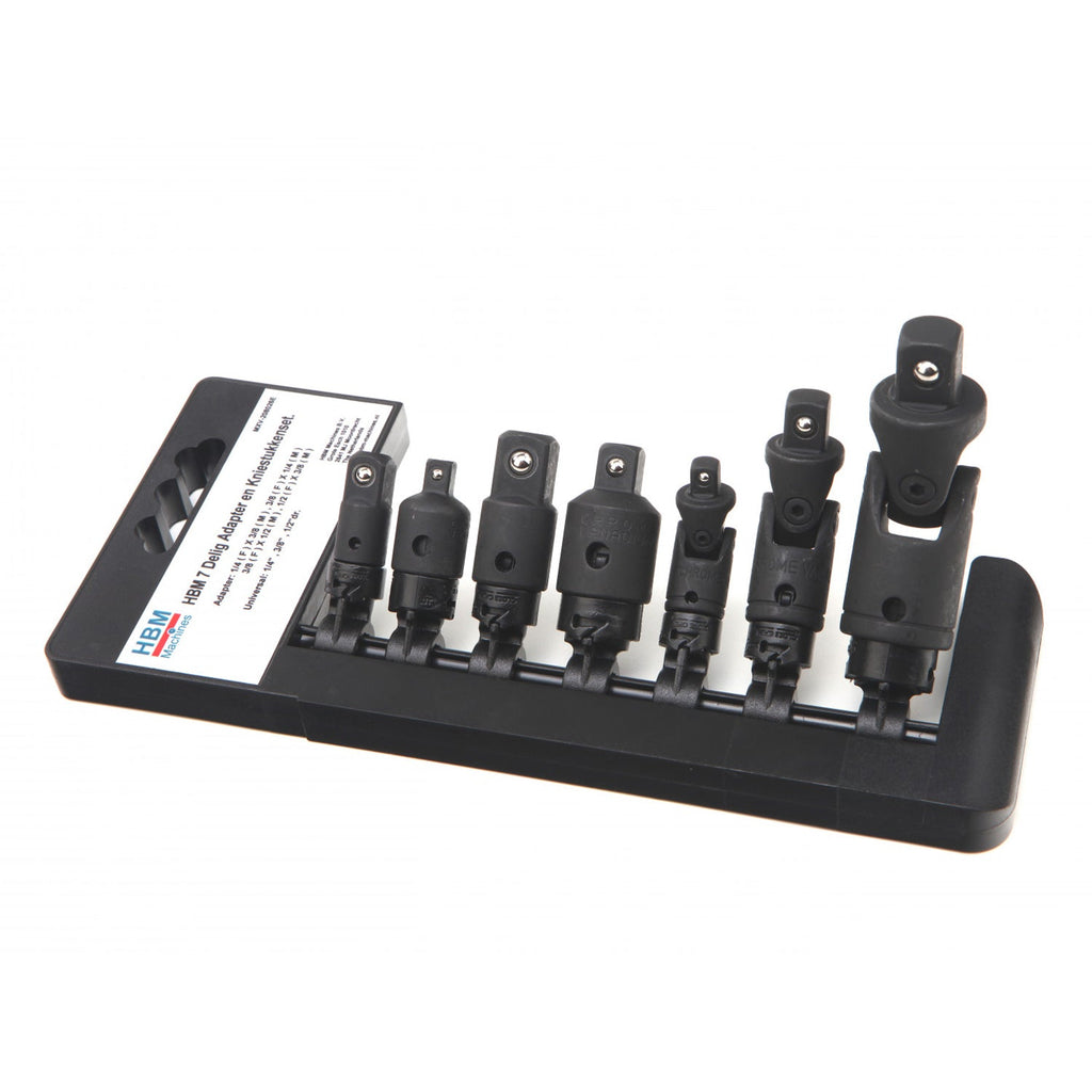 TÁTO SADA NÁRAZOVÝCH ADAPTÉROV 7 KUSOV HBM sa dá rýchlo pripojiť k nástroju vďaka úchytu s 2 kovovými guľôčkami. Adaptéry je možné použiť s rôznymi typmi pneumatického náradia.
