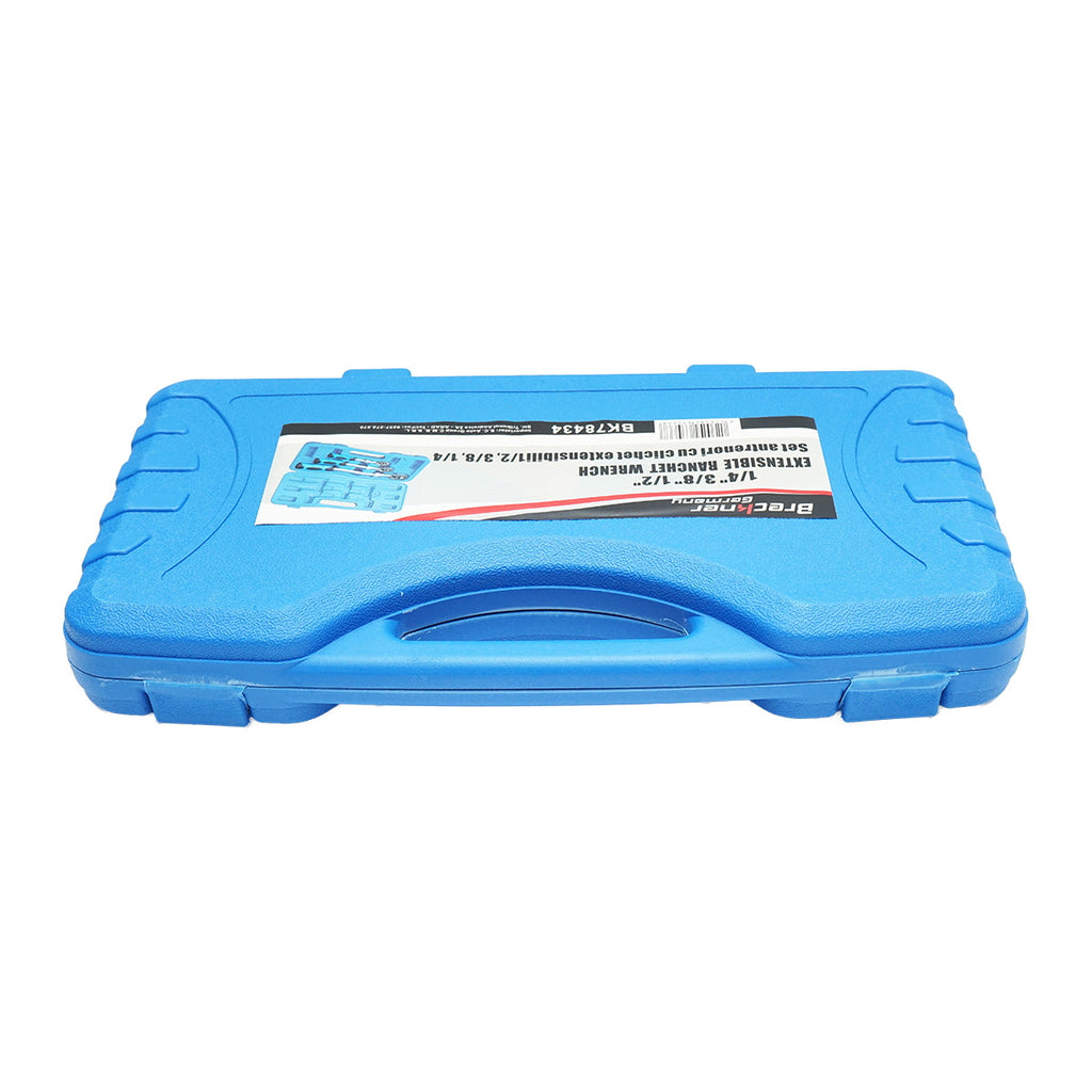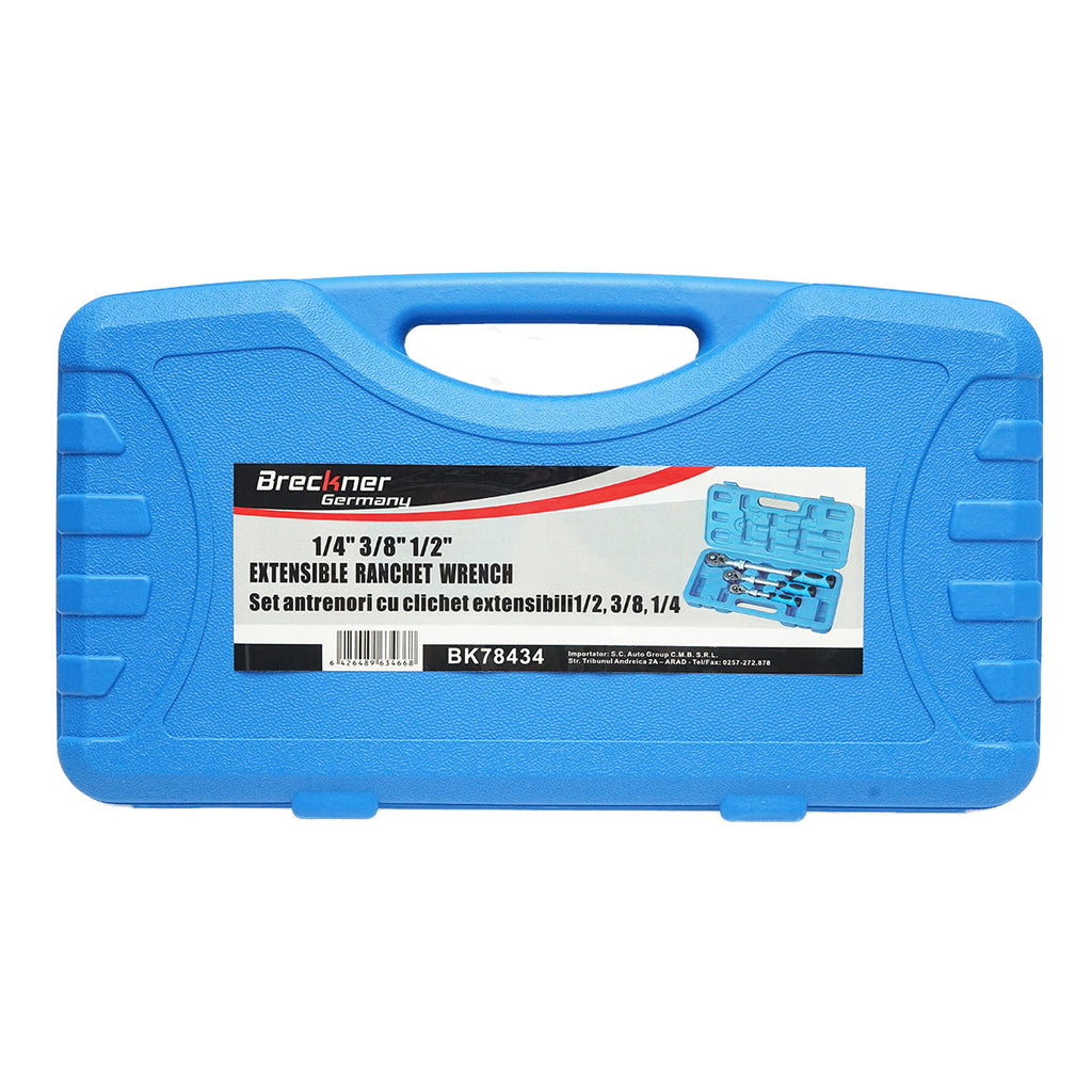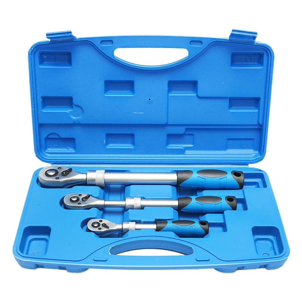 Tento súprava račňových kľúčov s reverzným a nastaviteľným (výsuvným) držadlom 1/4″, 3/8″, 1/2″ je univerzálna sada vhodná pre rôzne mechanické a servisné práce. Obsahuje tri račňové kľúče rôznych veľkostí (1/4″, 3/8″ a 1/2″), pričom každý z nich je vybavený reverzným mechanizmom a výsuvnou rukoväťou pre lepší dosah a komfort pri práci.