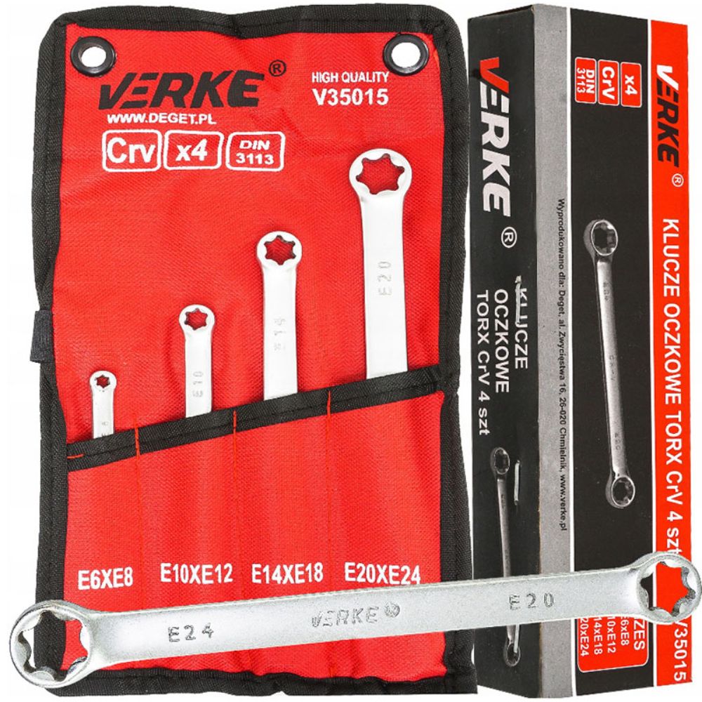 TÁTO SADA PRIAMYCH OČKOVÝCH KĽÚČOV PROFIL-E TORX E6-E24 obsahuje 4 TORX kľúče veľmi vysokej kvality vyrobené z chróm-vanádiovej ocele. Veľmi pevné a odolné kľúče vyrobené podľa noriem DIN 3113.