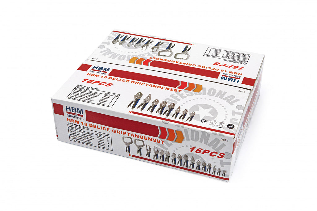 TÁTO SADA SAMOSVORNÝCH KLIEŠTÍ PRE KLEMPÍRSTVO 16 KUSOV je pomocníkom v autoservisoch. Sada obsahuje 3 stredné uzamykacie kliešte, 5 veľkých uzamykacích klieští, 2 malé uzamykacie kliešte, 2 švajčiarske uzamykacie kliešte, 2 upínacie kliešte, 1 kliešte so stredovým bodovým uzamykaním a 1 malé kliešte s bodom uchopenia.