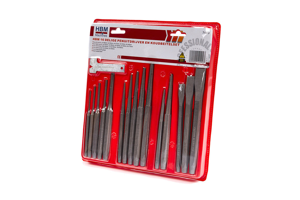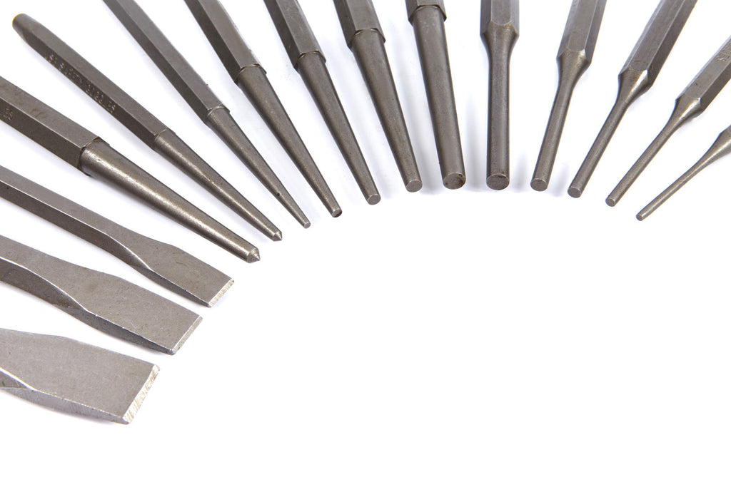 TÁTO SADA DLÁT A VYRAŽAČOV 16 KUSOV obsahuje kužeľové vyrážače, valcové vyrážače, vyrážacie hroty a dláta.