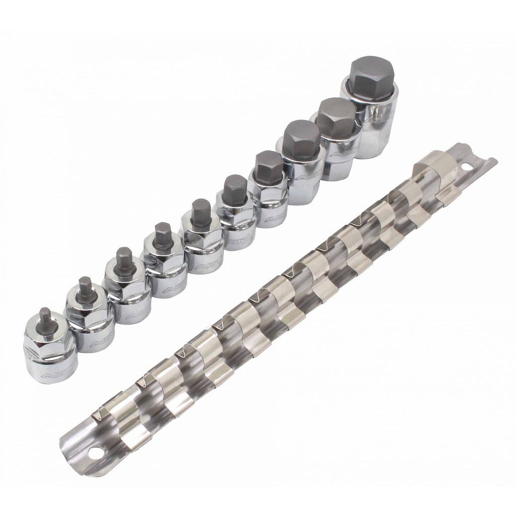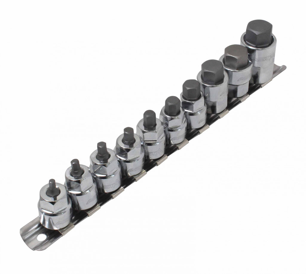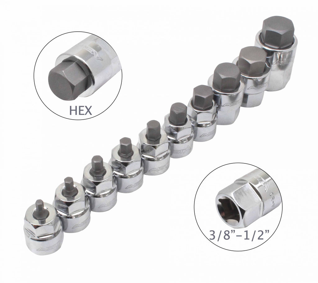 Hexagonálne hlavice sú umiestnené na kovovej lište, ktorá ponúka organizáciu a rýchly prístup počas práce. Táto sada je vhodná pre aplikácie v oblasti autoopravárenstva, opráv strojov, priemyslu, poľnohospodárstva a všade tam, kde sú potrebné imbusové kľúče v palcoch. Obsahuje nástavce s pohonom 3/8″ a 1/2″, s celkovou výškou medzi 28 a 40 mm a pracovnou výškou dielov 8 a 10 mm.