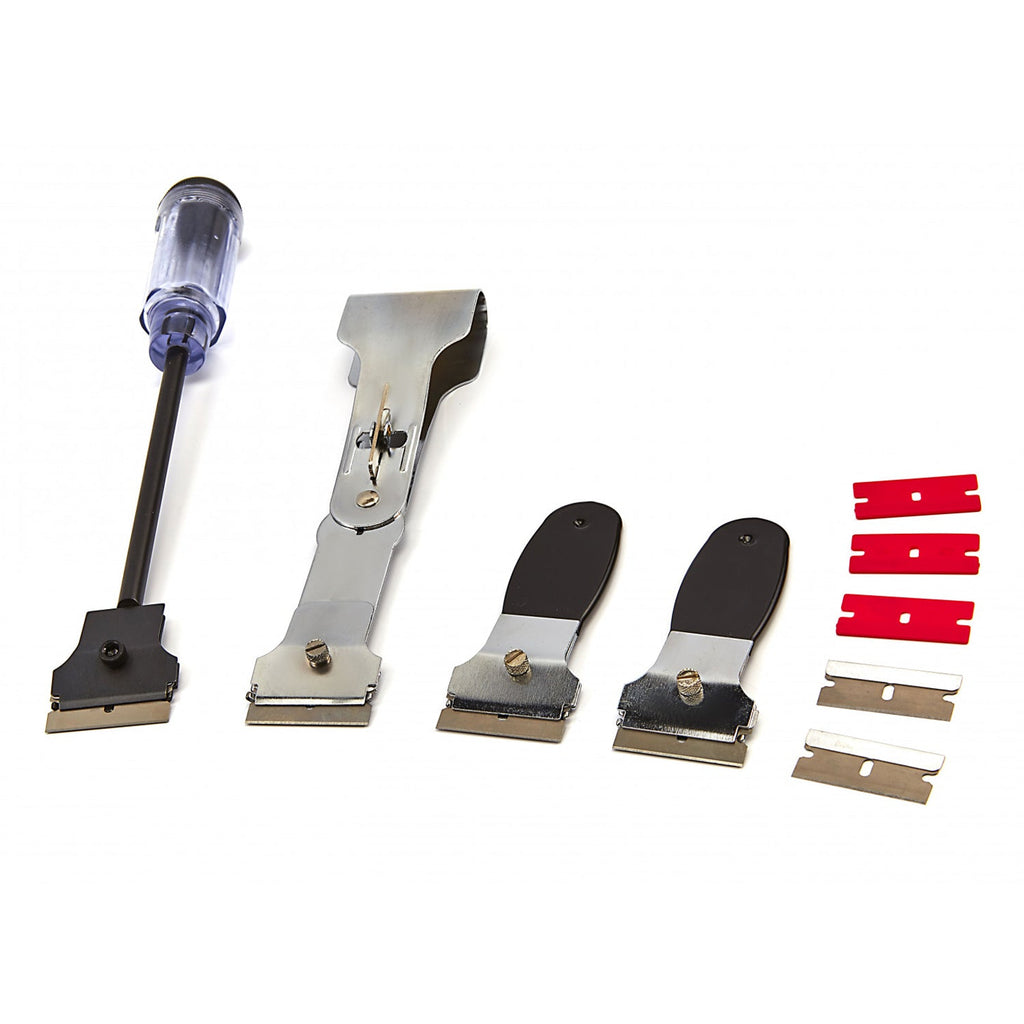 TÁTO SADA ŠKRABIEK S VYMENITEĽNÝMI ČEPEĽAMI je ideálna na rezanie zvyškov gumy z tesnení. Pomocou plastových čepelí je možné ľahko odstrániť ozdobné pásy alebo nálepky zo skla alebo lakovaných povrchov.