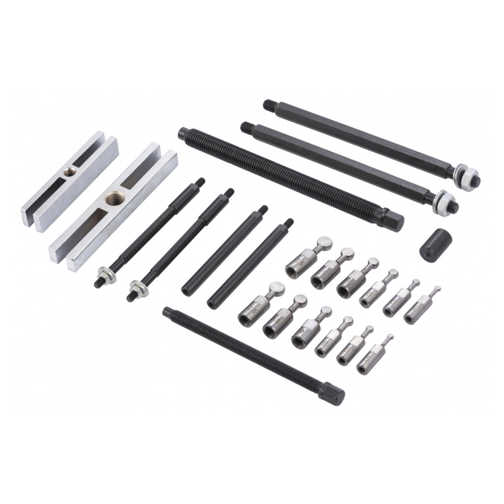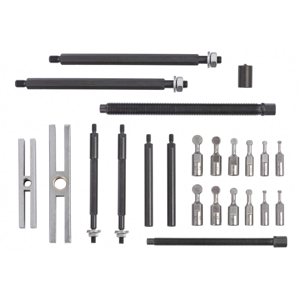 SADA SŤAHOVÁKOV LOŽÍSK 5–12,5 MM, 25KS je určená na demontáž guľkových ložísk pomocou uchytenia adaptérov s guľovými koncovkami do vnútorného krúžku ložiska. Po zablokovaní adaptérov umožňuje extraktor presné a bezpečné vytiahnutie ložiska.