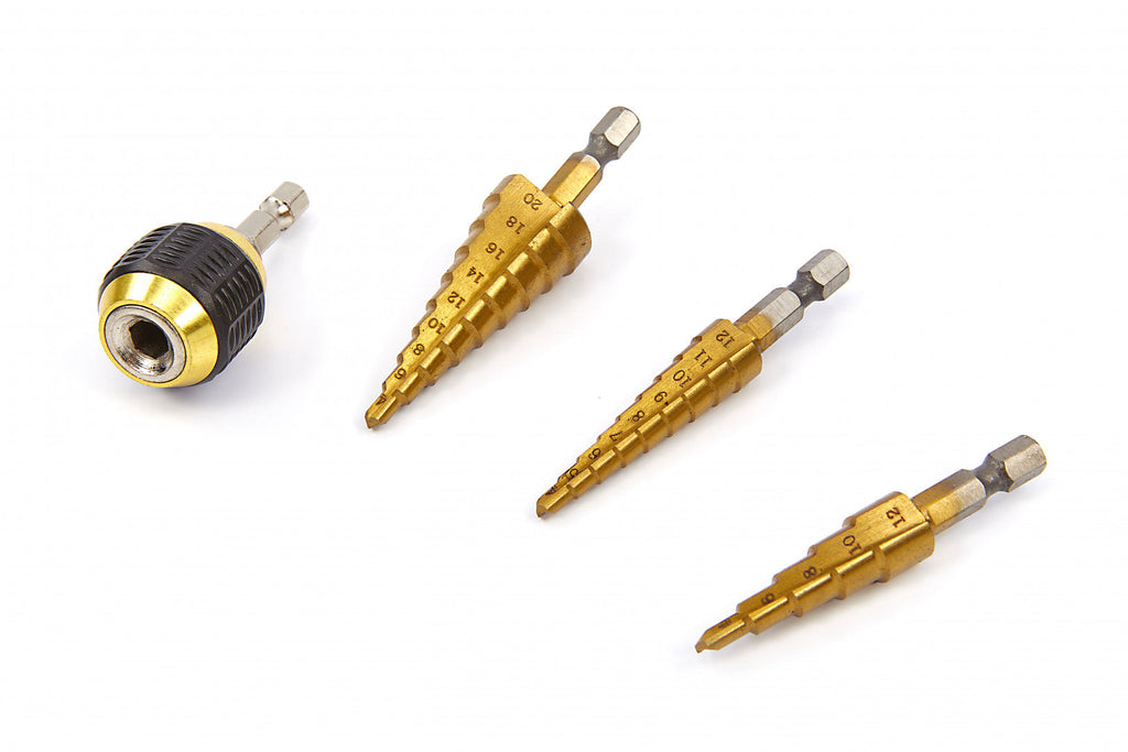TÁTO SADA STUPŇOVITÝCH VRTÁKOV 4 KUSY vám umožní vŕtať rýchlejšie, pretože majú HEX uchytenie 1/4" REC.