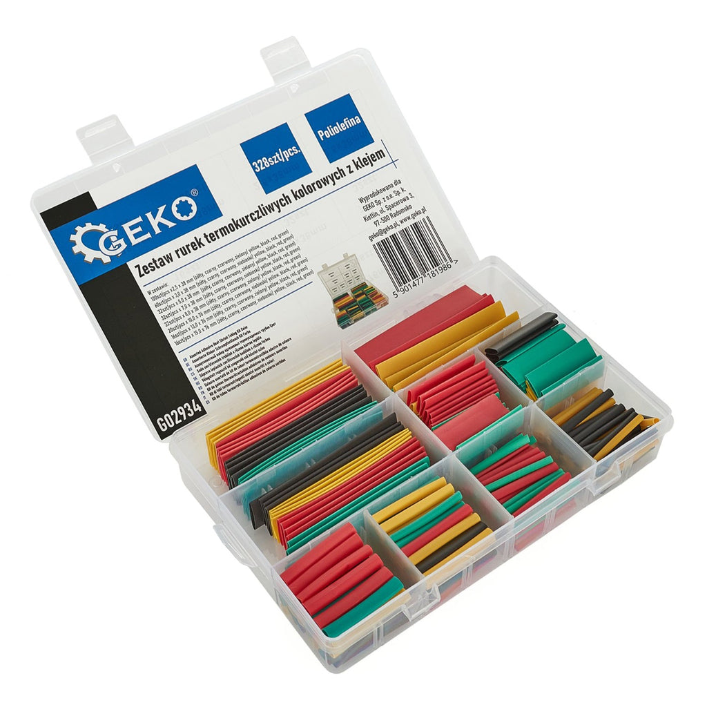 TÁTO SÚPRAVA TEPELNE ZMRŠŤOVACÍCH TRUBÍC 328 KUSOV GEKO je vyrobená zo špeciálneho materiálu, ktorý sa kontrolovane zmršťuje pri zahriatí, čím poskytuje bezpečnú a pevnú izoláciu okolo káblov.