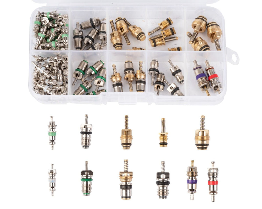 SÚPRAVA VENTILOV KLIMATIZÁCIE 100 KUSOV obsahuje 100 ventilov pre automobilové klimatizačné systémy, rozdelených do 10 rôznych typov, určených na montáž a demontáž komponentov v okruhoch klimatizácie. Ventily sa líšia veľkosťou, závitom a farbou, pričom sú kompatibilné s rôznymi typmi systémov. Sada obsahuje 70 ventilov typu 5V1 s dĺžkami 19,3 mm a 19,4 mm, obe s priemerom 1,8 mm, po 35 kusov z každého typu.