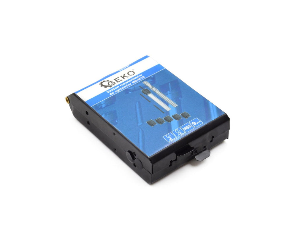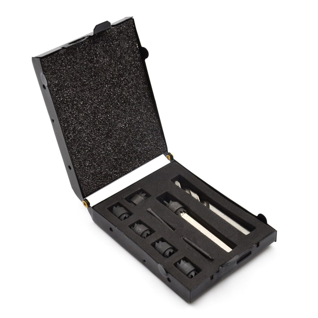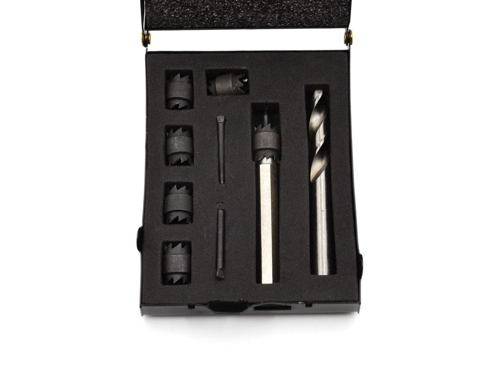 TÁTO SADA VRTÁKOV NA ZVÁRACIE BODY M8-M10 9 KUSOV GEKO obsahuje šesť rezacích koruniek s dvoma stranami, tri stredové body na presnejšie vŕtanie, rezač zvarov a HSS vrták s priemerom 8 mm.