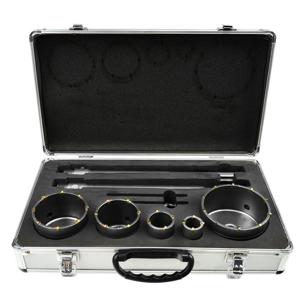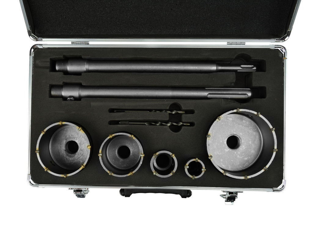 TÁTO SADA KORUNIEK NA BETÓN 9 KUSOV obsahuje prvky s priemermi od 30 do 100 mm, všetky s hĺbkou 75 mm. V sade sú zahrnuté aj adaptéry typu SDS plus a SDS max s dĺžkou 300 mm, ako aj 2 vodiace vrtáky.