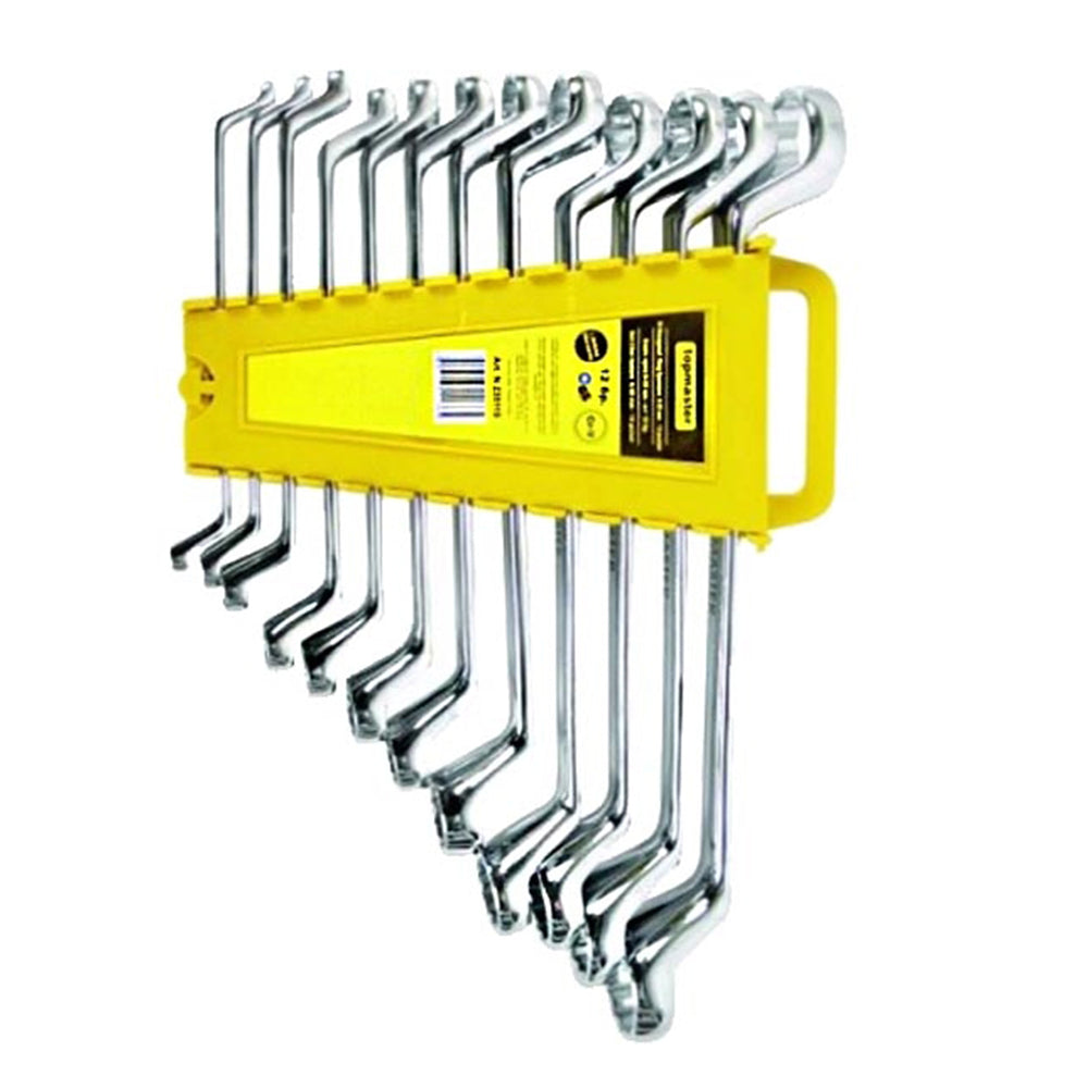 TÁTO SADA DVOJITÝCH OČKOVÝCH OHNUTÝCH KĽÚČOV 6-32MM 12 KUSOV TOPMASTER je vyrobená z vysoko kvalitnej chróm-vanádiovej ocele a puzdro, v ktorom sú kľúče uložené, je praktické na skladovanie.