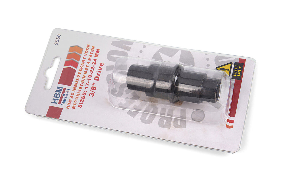 TENTO IMBUSOVÝ KĽÚČ PREDNEJ NÁPRAVY MOTOCYKLA, PREMIUM, HBM MACHINES HOLANDSKO má prípojku 3/8", čo umožňuje jednoduché pripojenie k račni s prípojkou 3/8". Imbusový kľúč sa používa na uvoľnenie a utiahnutie prednej osi motocykla. Špeciálne navrhnutý konektor s rozmermi: 17 - 19 - 22 a 24 mm môže byť použitý aj pre iné motocykle BMW, Yamaha, Kawasaki, Suzuki a Honda. Imbusový kľúč je možné použiť aj s konektorom 17 alebo 19 mm.