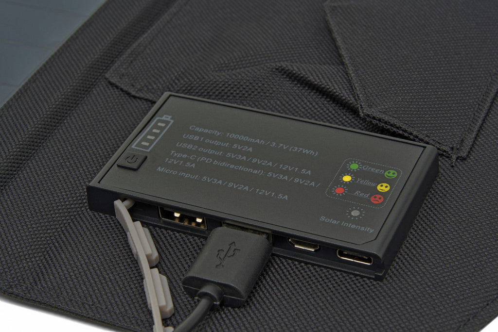 TENTO SKLADACÍ A PRENOSNÝ FOTOVOLTAICKÝ SOLÁRNY PANEL 15W S AKUMULÁTOROM 10000 MAH je užitočný, pretože zachytáva slnečnú energiu, ktorá sa následne premieňa na elektrickú energiu.