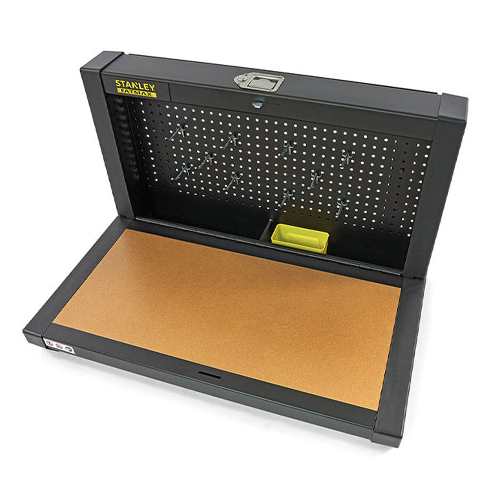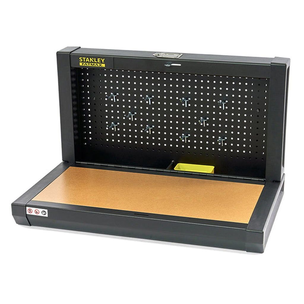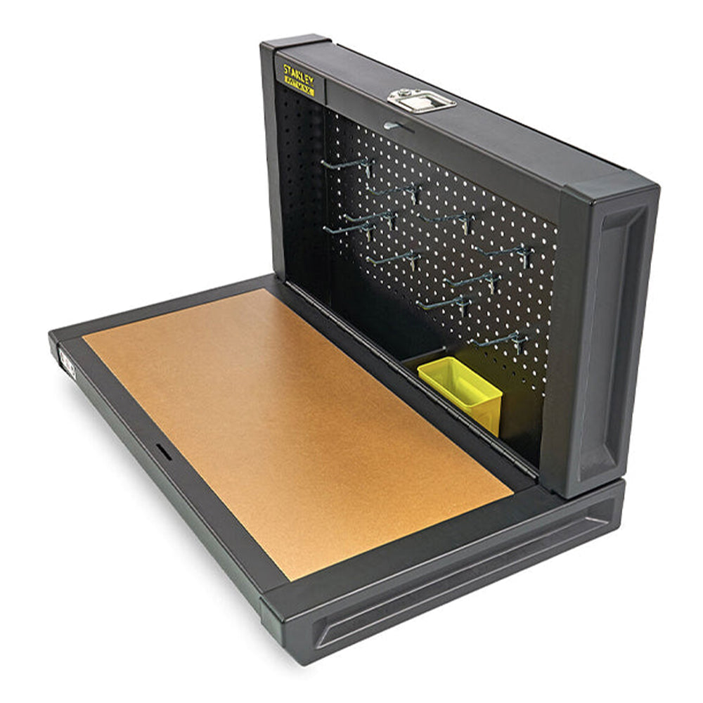 TENTO SKLADACÍ PRACOVNÝ STÔL 900 X 450 X 450 MM STANLEY má integrované otvory na montáž na stenu. Je vybavený blokovacím systémom a výsuvný pracovný stôl má priestor na odkladanie nástrojov.