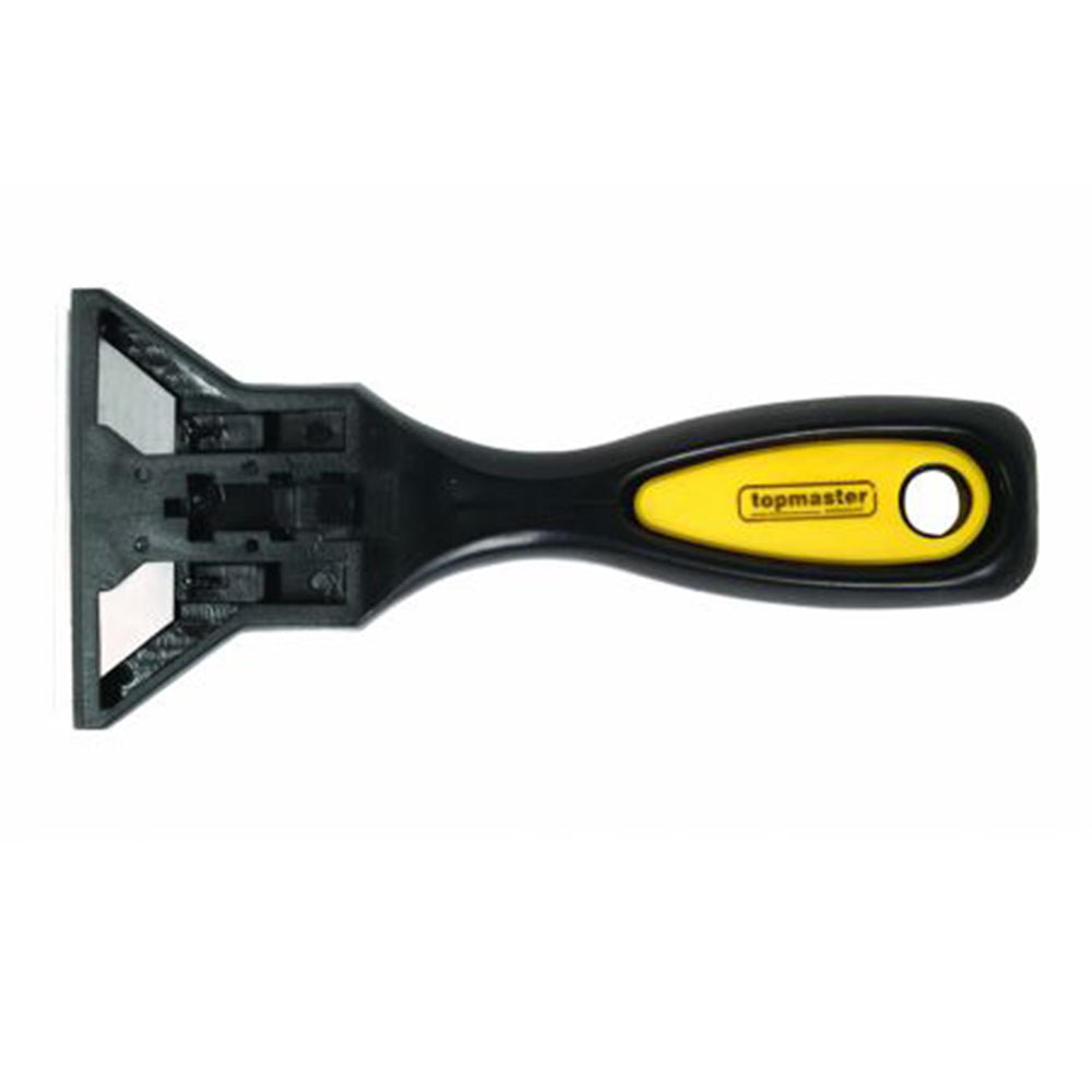 TENTO RUČNÝ ŠKRABÁK S 10 NÁHRADNÝMI ČEPEĽAMI TOPMASTER sa používa na odstraňovanie lepidla alebo farieb zo sklenených alebo kovových povrchov.