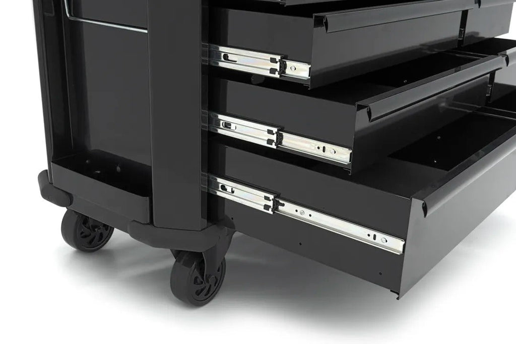 Skriňa je vybavená 4 kolieskami – 2 otočnými s brzdou a 2 pevnými – pre mobilitu a stabilitu, a má zámok na zabezpečenie náradia. Produkt nemá dvierka, nie je dodatočne vybavený a neobsahuje odpadkový kôš.