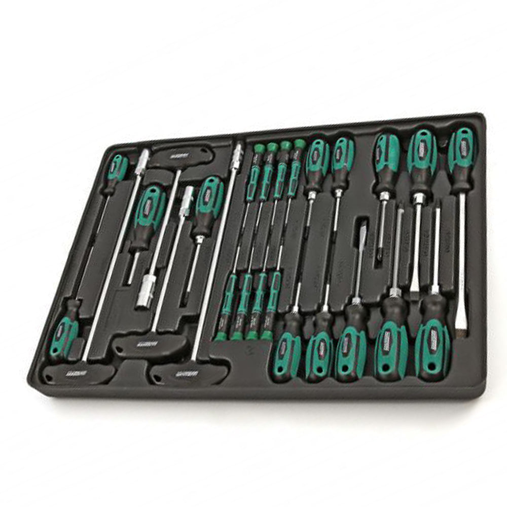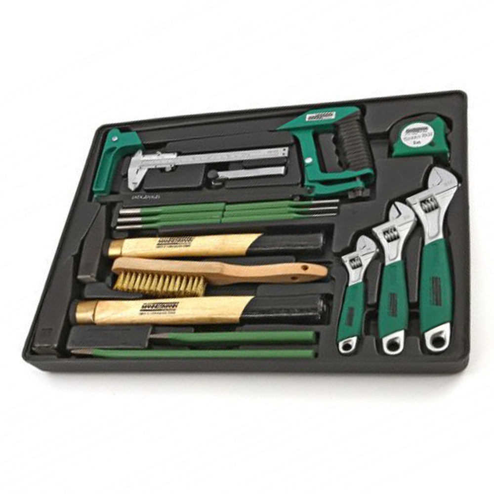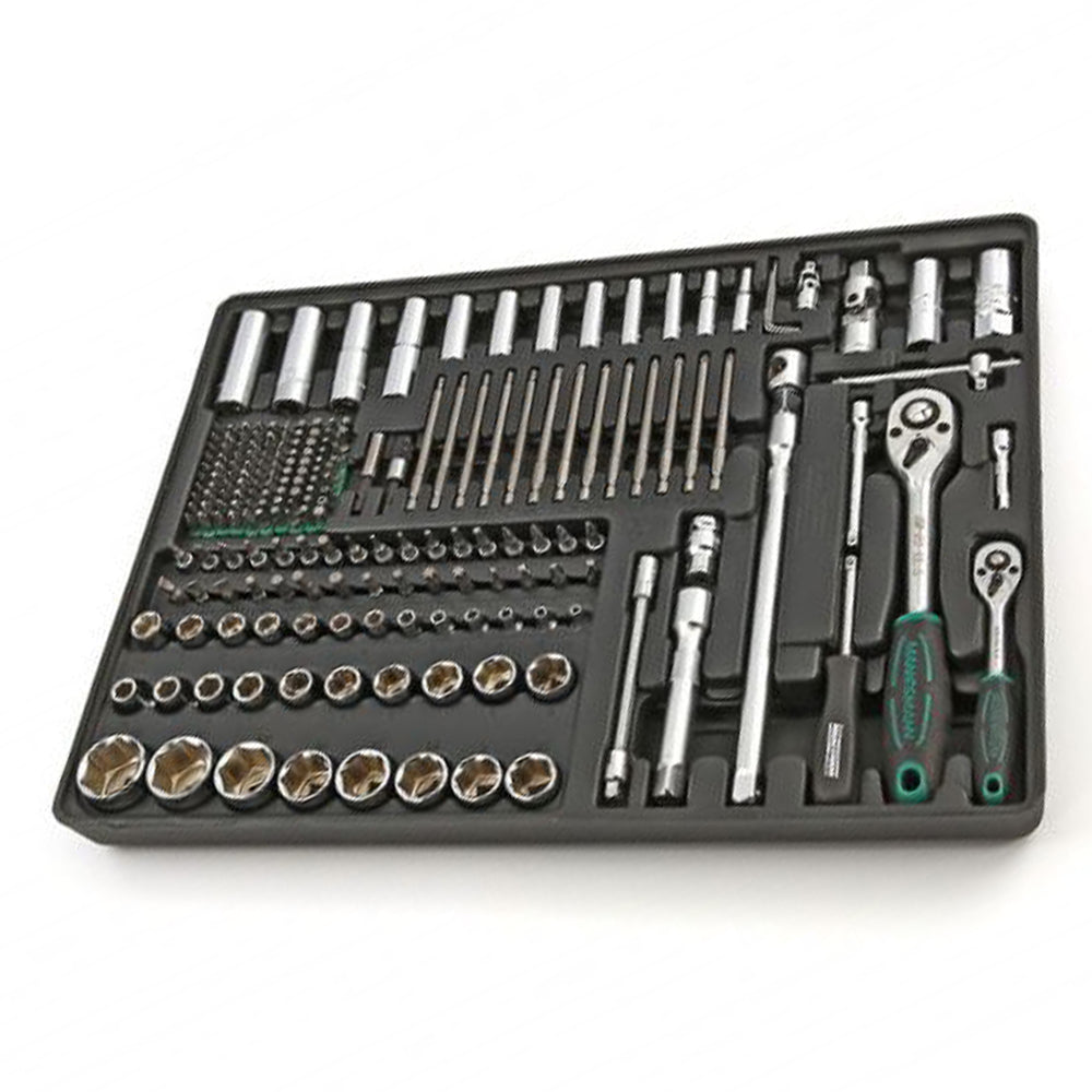 - obsahuje: hlavice, očkové kľúče, ráčňové kľúče, kardanové kľúče, kliešte, bity, skrutkovače, kladivá, T-Torx a imbusy