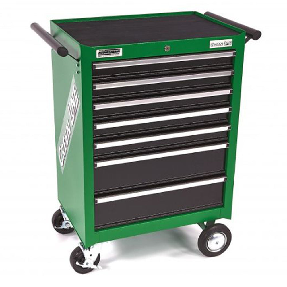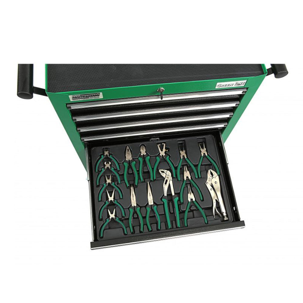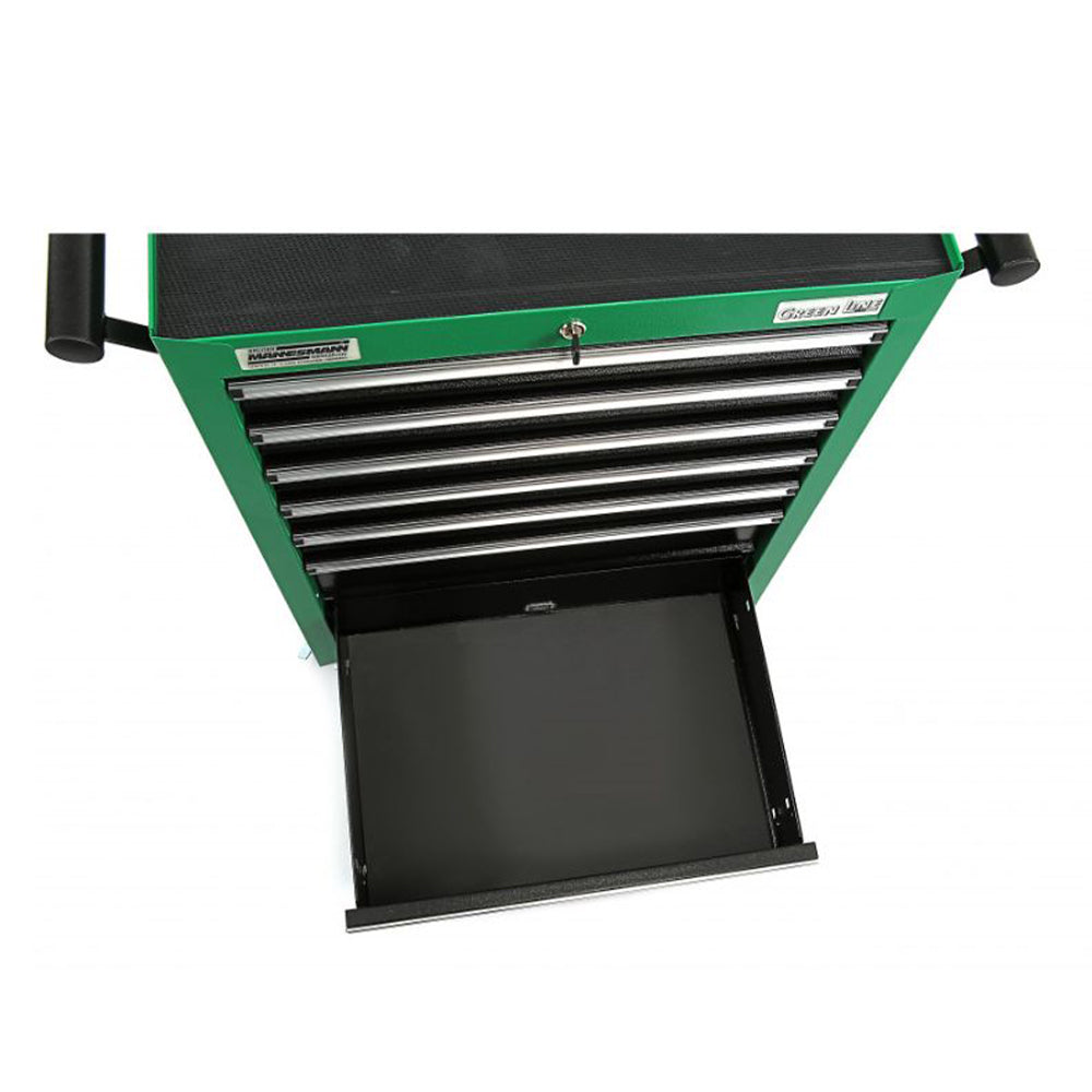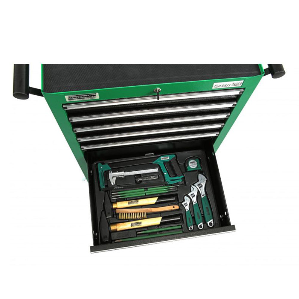 TÁTO SKRIŇA MANNESMANN SO 7 ZÁSUVKAMI VYBAVENÁ 321 KUSMI NÁRADIA je vyrobená z pevného oceľového plechu, s práškovým zeleným povrchom, vybavená 7 zásuvkami a výsuvným dorazom na guľôčkových ložiskách. Okrem toho má pracovnú dosku s protišmykovým povrchom, ktorá je odolná proti nárazu a má ďalšie úložné priehradky na náradie a malé diely. Skrinka je mobilná vďaka 2 pevným a 2 otočným kolieskam s brzdou.