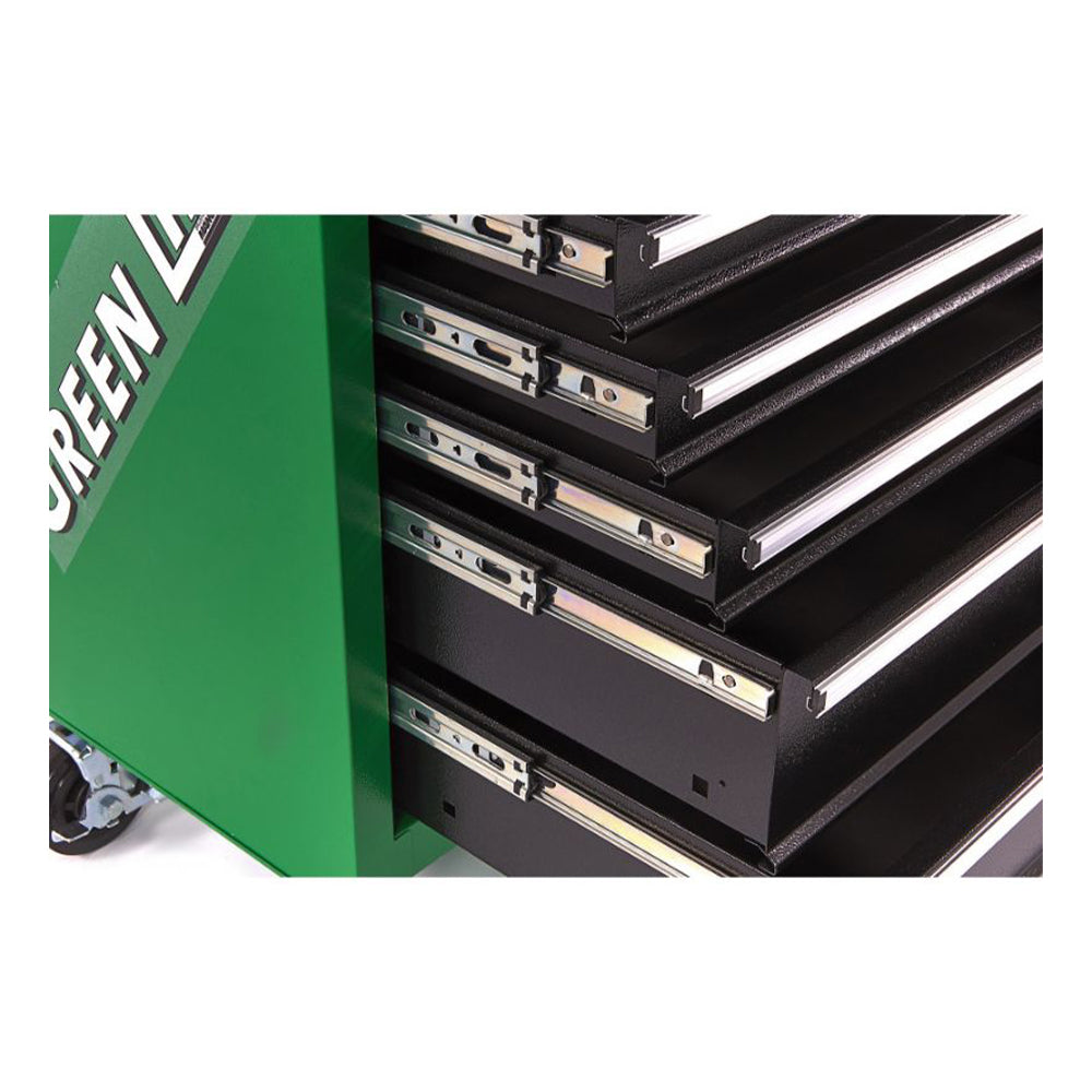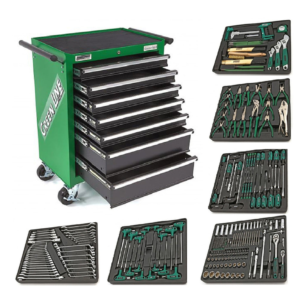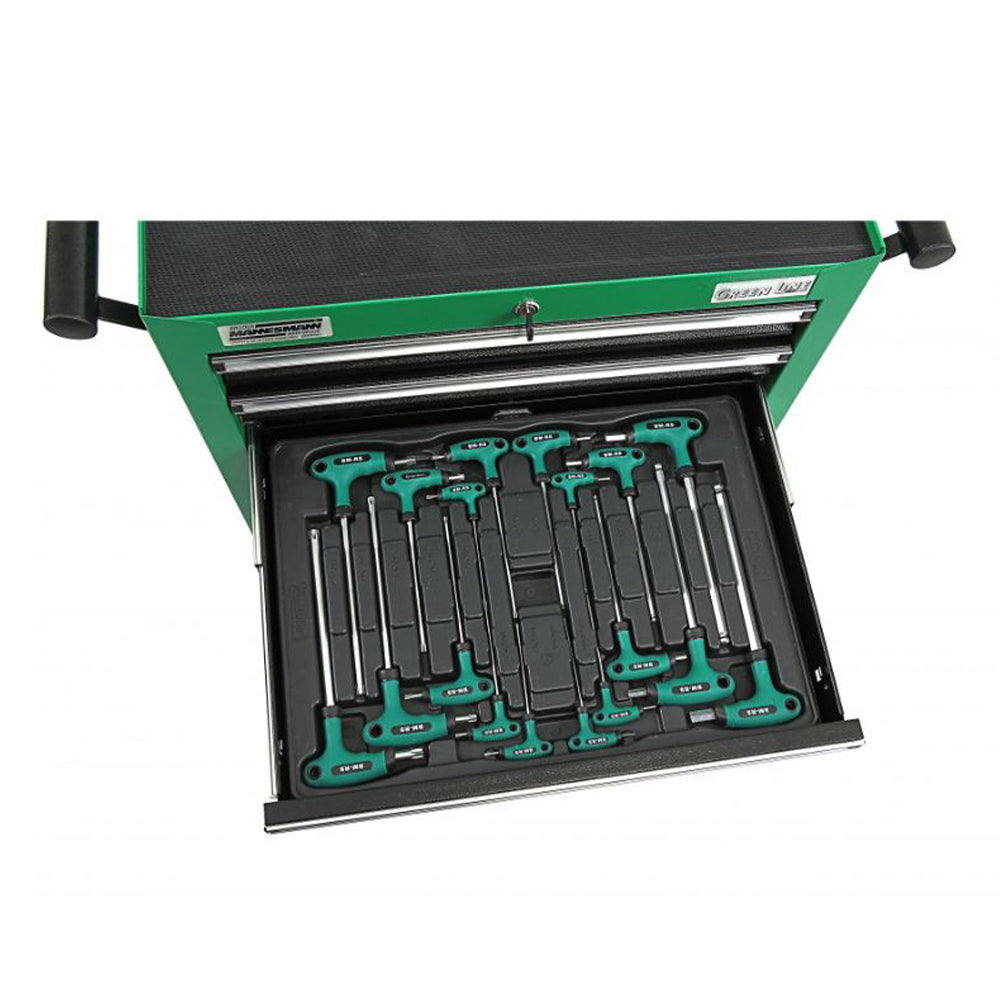 TÁTO SKRIŇA MANNESMANN SO 7 ZÁSUVKAMI VYBAVENÁ 321 KUSMI NÁRADIA je vyrobená z pevného oceľového plechu, s práškovým zeleným povrchom, vybavená 7 zásuvkami a výsuvným dorazom na guľôčkových ložiskách. Okrem toho má pracovnú dosku s protišmykovým povrchom, ktorá je odolná proti nárazu a má ďalšie úložné priehradky na náradie a malé diely. Skrinka je mobilná vďaka 2 pevným a 2 otočným kolieskam s brzdou.