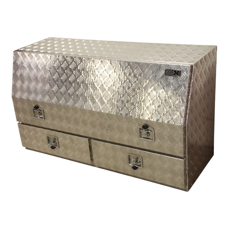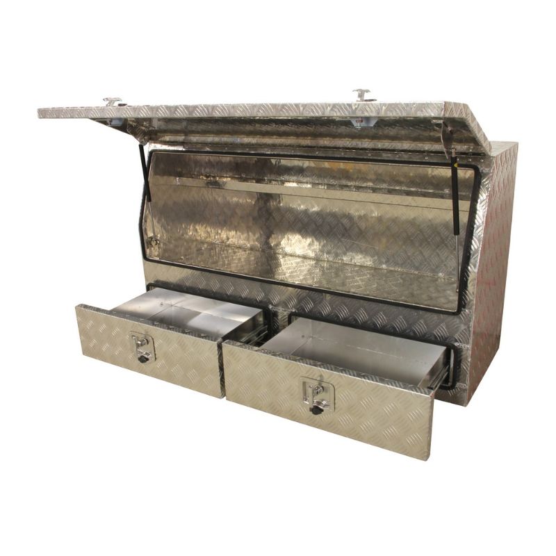 TRUCHA S DVEREAMI A 2 ZÁSUVKAMI PRE NÁRADIE Z VYRAZENEJ HLINÍKOVEJ DOSKY sa dá pripevniť pod podvozok nákladného auta alebo prívesu. Môžu sa v nej ukladať rôzne predmety, náradie a ďalšie. Truhlica je vybavená slušným zámkom.