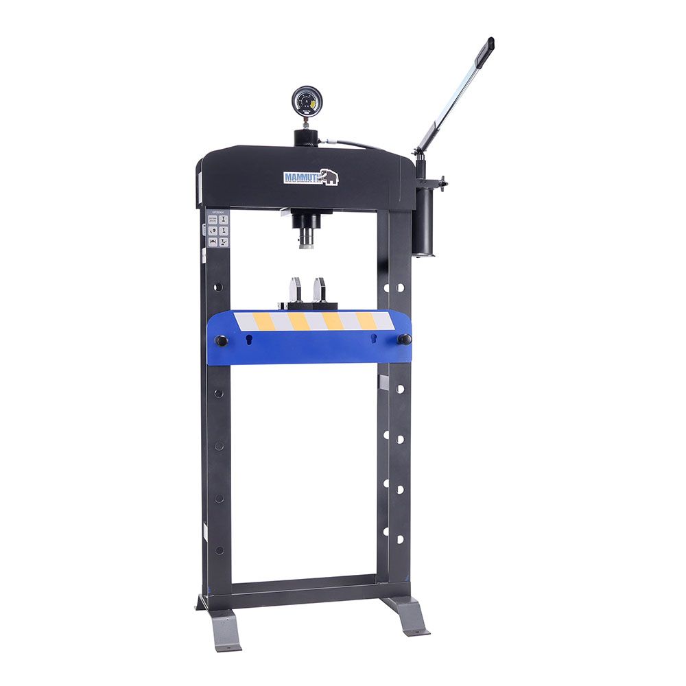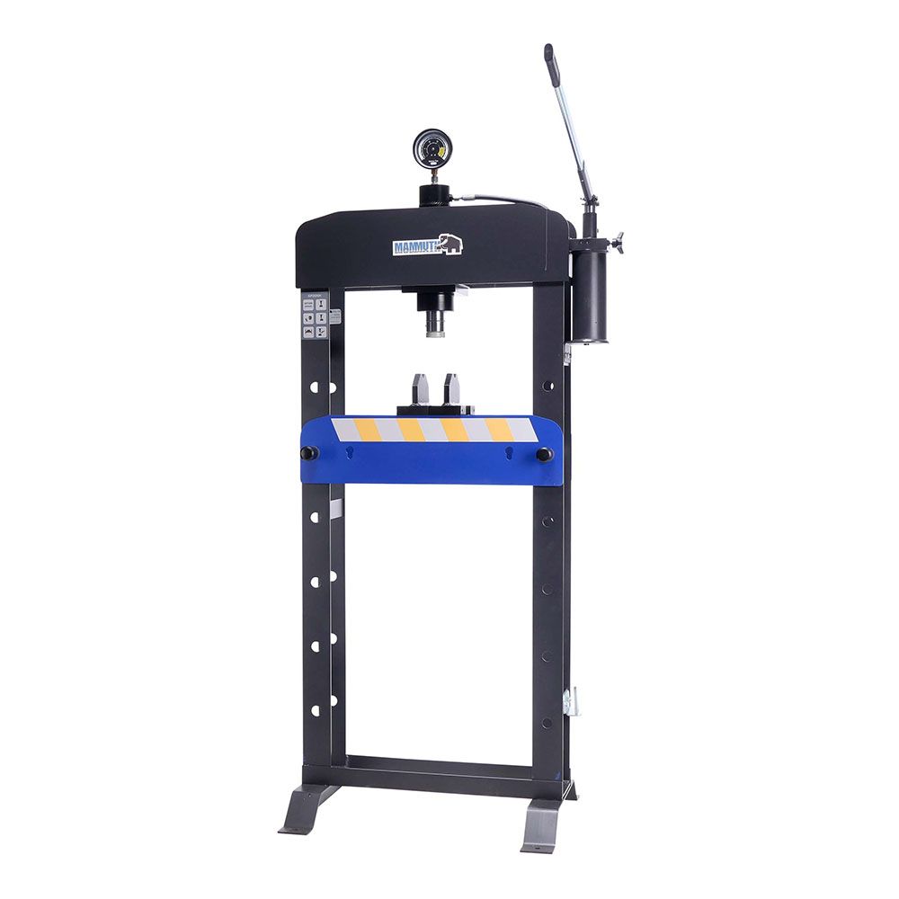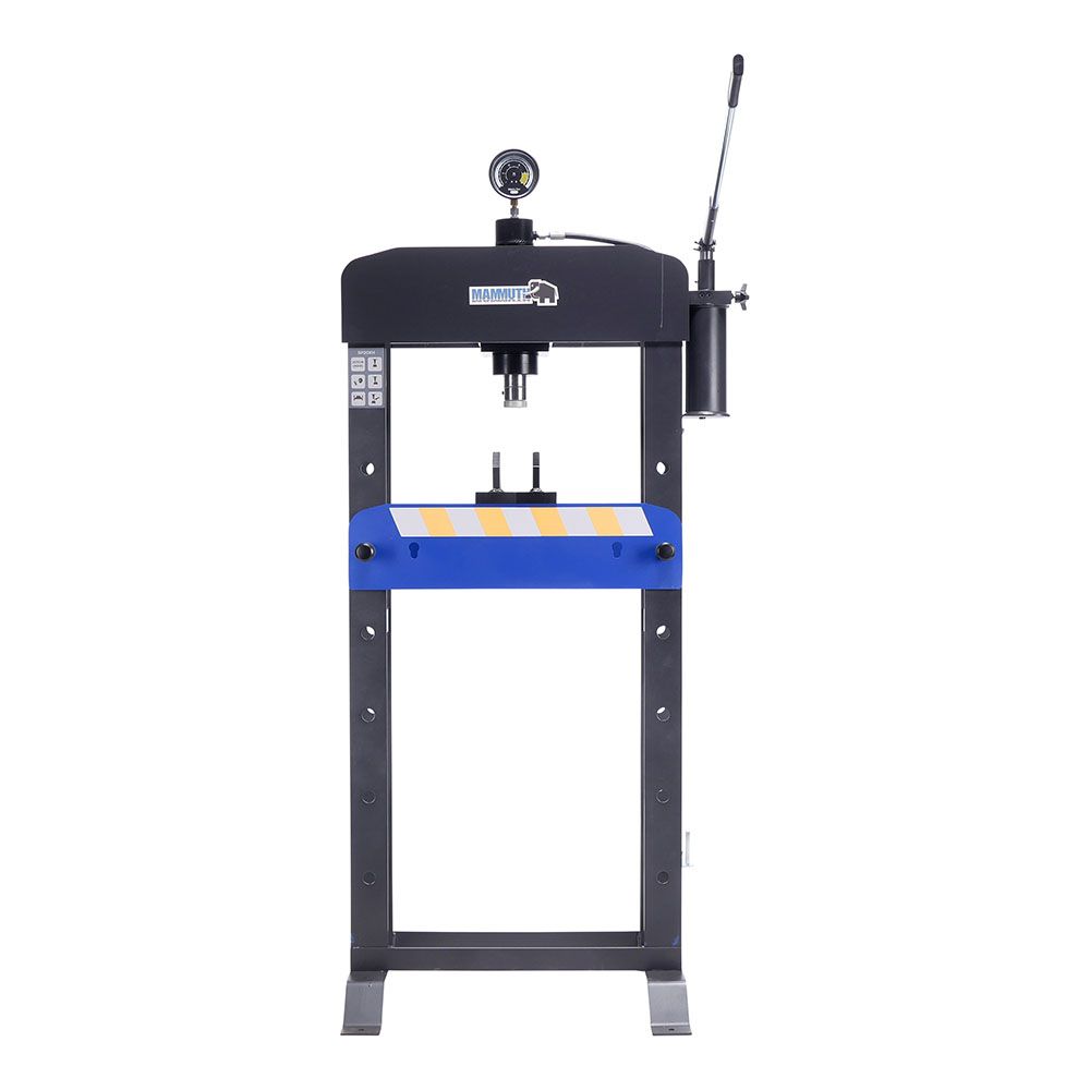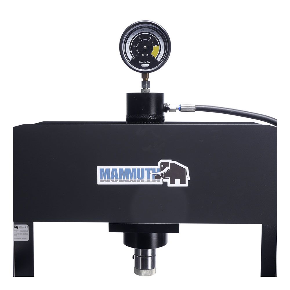 STACIONÁRNY HYDRAULICKÝ LIS 20T MAMMUTH je vhodný na montáž ložísk, lisovanie hriadeľov a skrutiek, ohýbanie rúr a ďalšie lisovacie práce, kde je potrebná veľká sila. Lis má pevný, kompletne zváraný rám. Tlak v kilogramoch je možné jasne odčítať na manometri.