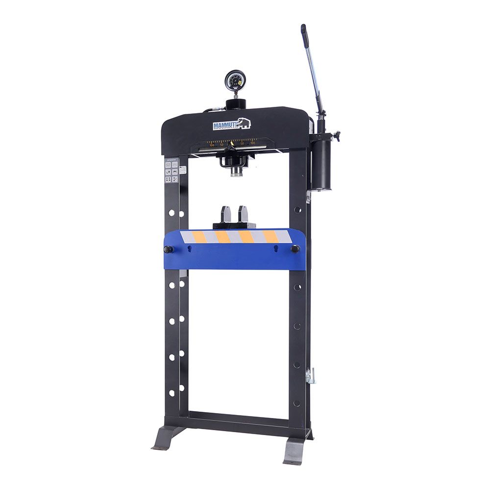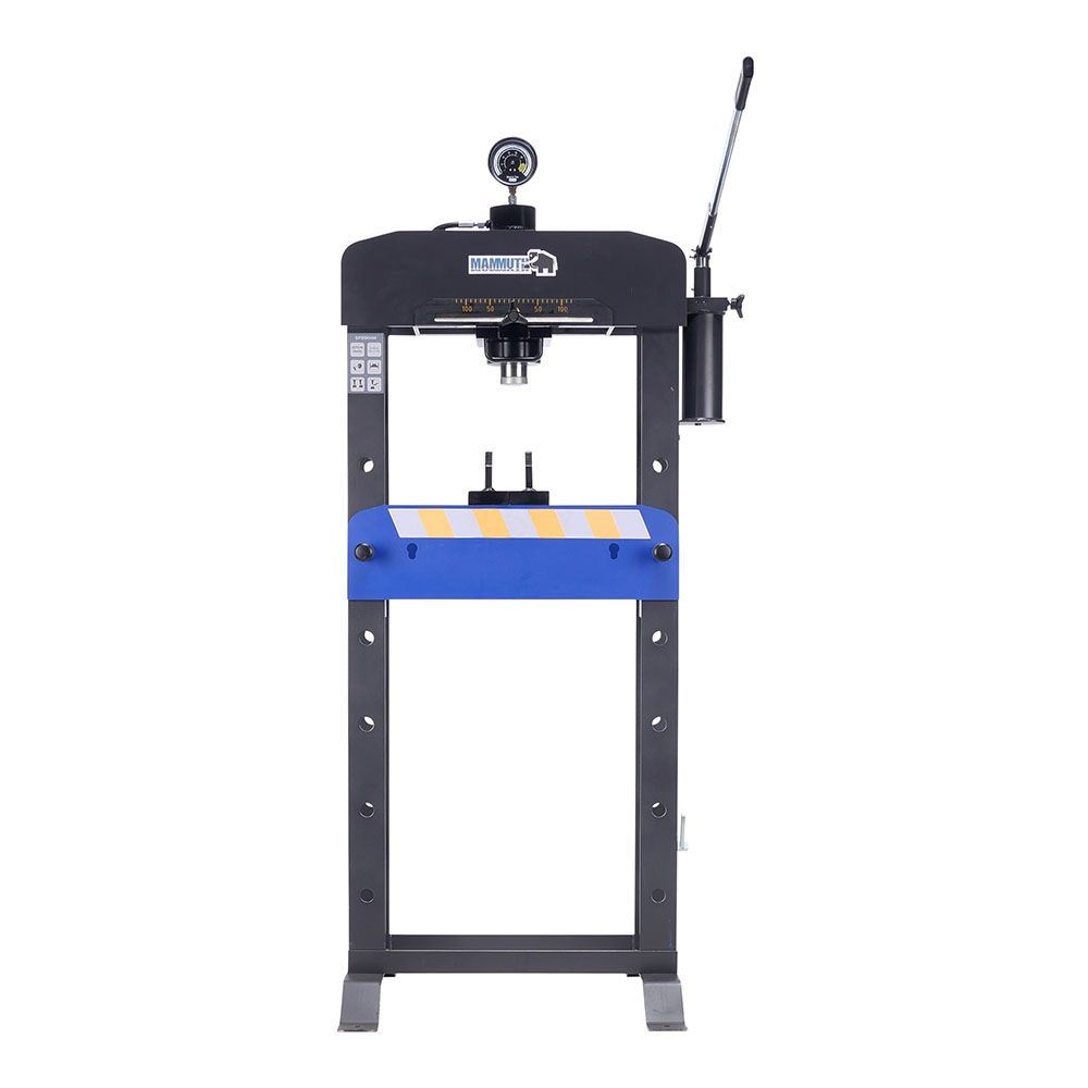 STACIONÁRNY HYDRAULICKÝ LIS 30T MAMMUTH je vhodný na montáž ložísk, lisovanie hriadeľov a skrutiek, ohýbanie rúr a ďalšie lisovacie práce, kde je potrebná veľká sila. Lis má pevný, kompletne zváraný rám. Tlak v kilogramoch je možné jasne odčítať na manometri.