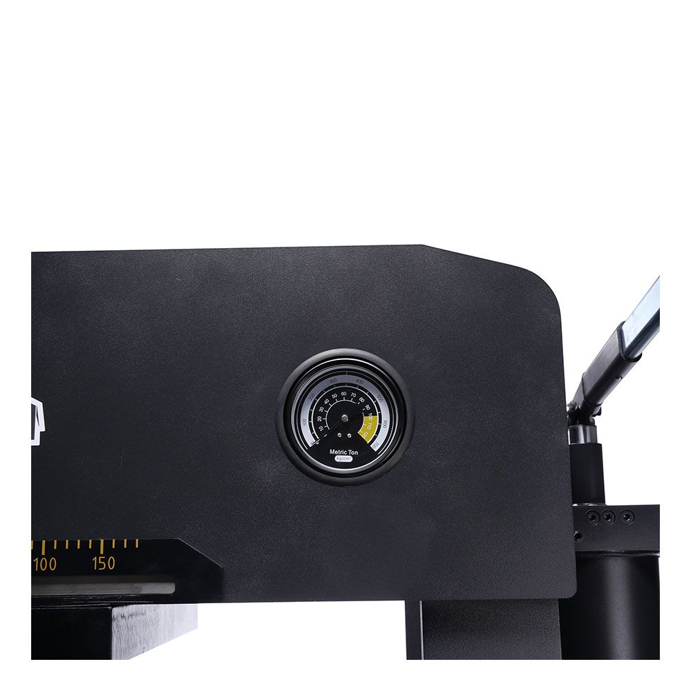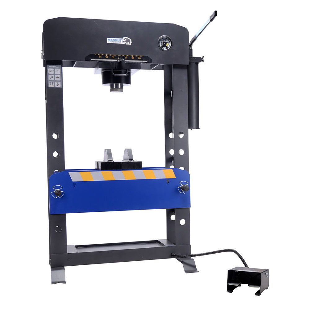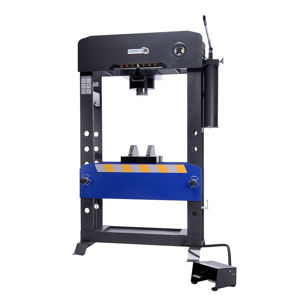 STACIONÁRNY HYDRO-PNEUMATICKÝ LIS S PEDÁLOVÝM OVLÁDANÍM 100T MAMMUTH je vhodný na montáž ložísk, lisovanie hriadeľov a skrutiek, ohýbanie rúr a ďalšie lisovacie práce, kde je potrebná veľká sila. Lis má pevný, kompletne zváraný rám. Tlak v kilogramoch je možné jasne odčítať na integrovanom manometri.