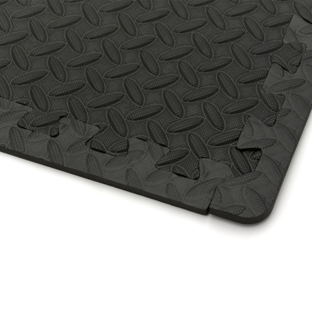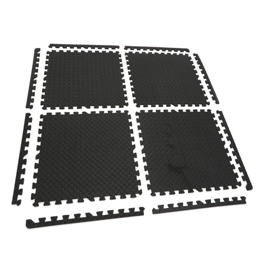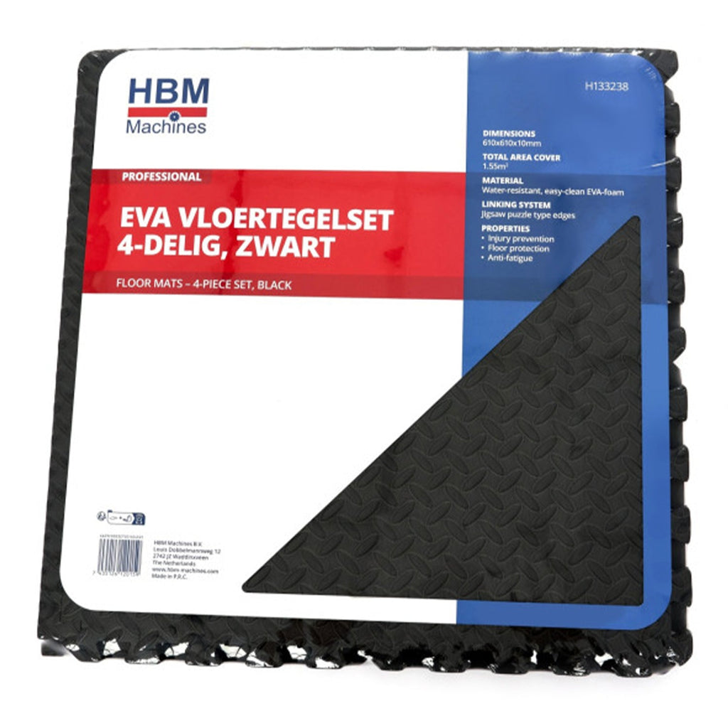 SÚPRAVA 4 PODLAHOVÝCH OCHRANNÝCH DOSIEK Z EVA PENY TYP PUZZLE PROTIŠMYKOVÉ NA PODLAHU ČIERNE 61X61CM HBM MACHINES je ideálnym riešením na ochranu vašej dielne, garáže alebo fitness centra pred opotrebovaním a poškodením. Vyrobené z vysokokvalitnej EVA peny, tieto dosky poskytujú pohodlný povrch absorbujúci nárazy. Jedna doska má rozmery 610 x 610 x 10 mm a celková plocha je približne 1,55 m².