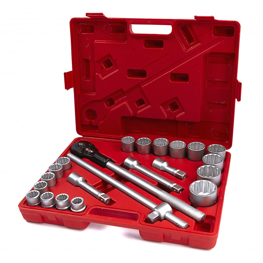 SADA DVOJHEXAGONÁLNYCH NÁSTRČNÝCH KĽÚČOV S RÁCETOM 3/4 19-50MM 22 KS má rozmery od 19 do 50 mm a pozostáva z 22 dielov.