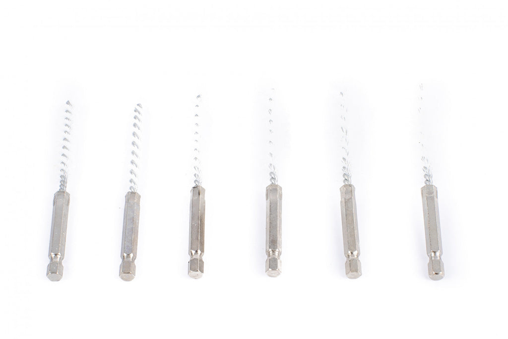 - Oceľové kefy 6 kusov: 6,35 / 9,5 / 12,7 / 15,9 / 19 / 25,4 mm