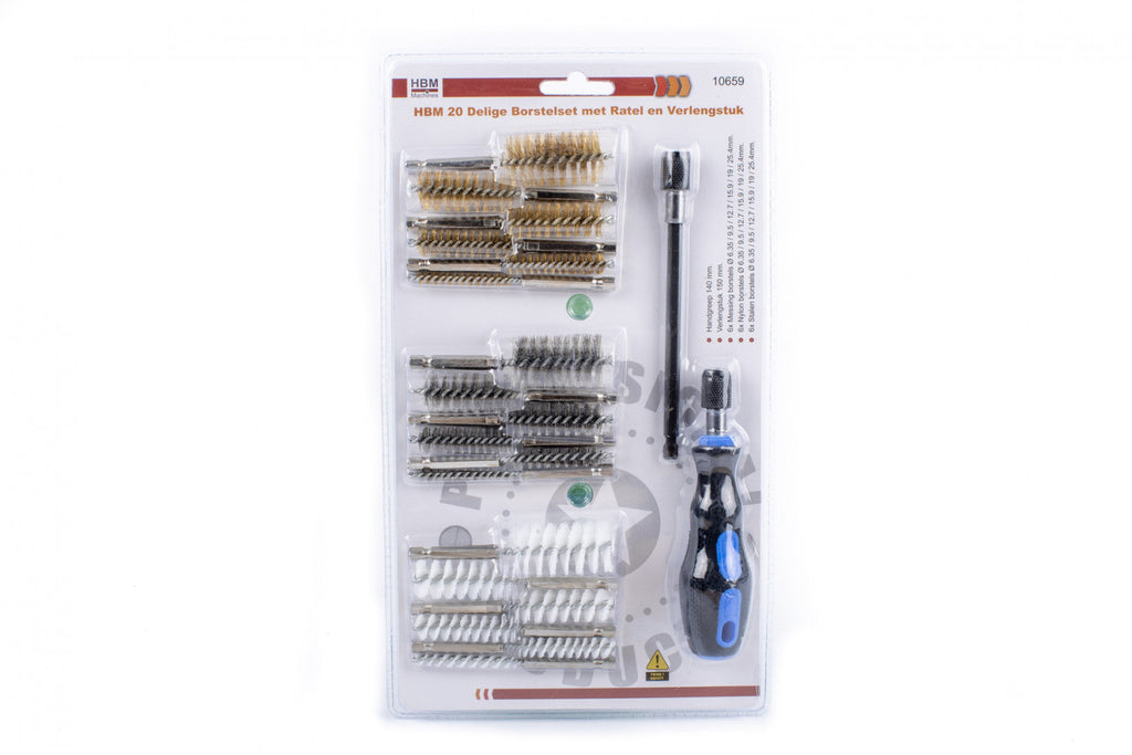 TÁTO SADA KEFIEK NA ČISTENIE KANÁLOV A LÔŽOK VSTREKOVAČOV 20 KUSOV HBM obsahuje račňu s predĺžením a 18 rôznych kefiek. Sada je vhodná na čistenie otvorov a rôznych povrchov pracovných dielov.