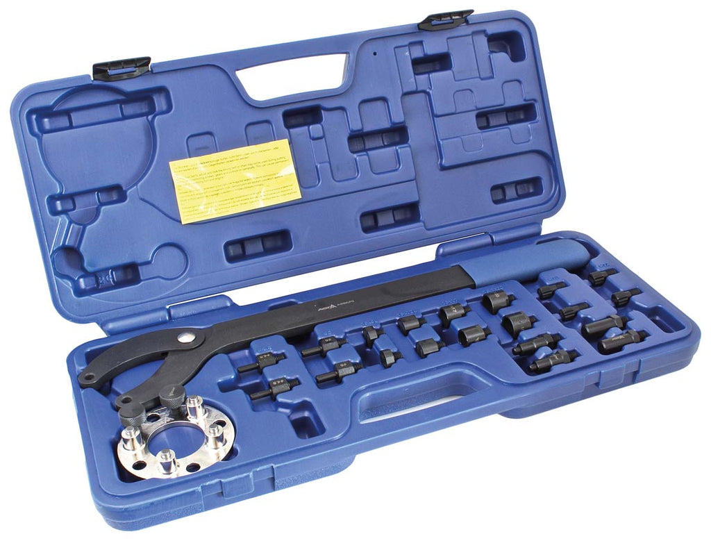TÁTO SADA KĽÚČOV NA BLOKOVANIE REMENÍC A OZUBENÝCH KOLIES umožňuje nastavenie rozvodu v hornej úvrati. Vhodná na demontáž vačkového hriadeľa, výmenu rozvodového remeňa, olejového čerpadla, tlmiča vibrácií, kontrolu nastavenia hriadeľa a blokovanie kľukového hriadeľa.
