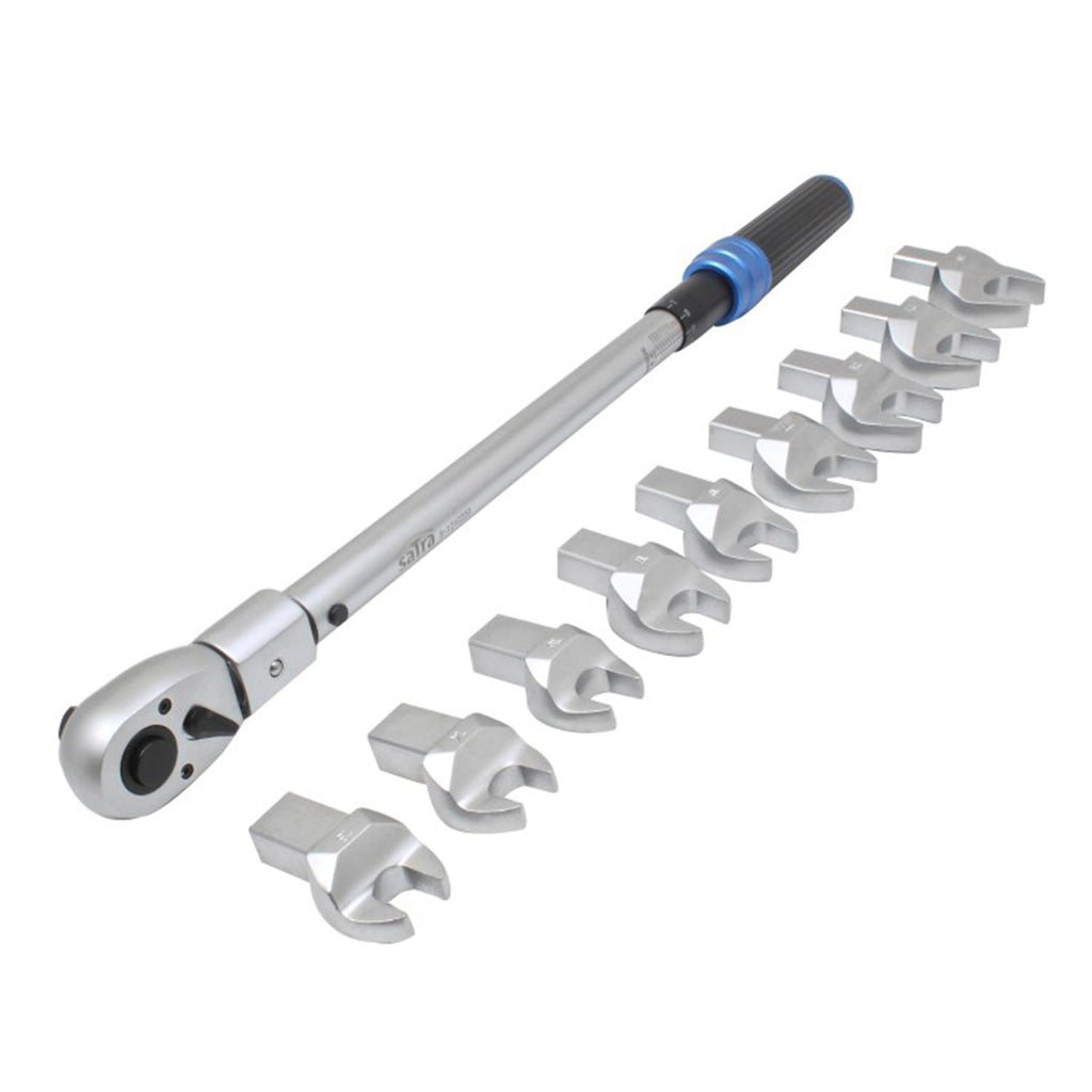 Mechanizmus odpojenia momentu je kombinovaný s vysokokvalitnou tlačnou pružinou. Ploché nástavce umožňujú aplikáciu momentu v miestach, kde nie je možný priamy prístup zhora. Súprava je dodávaná s plochými hlavami 13, 14, 15, 17, 19, 22, 24, 27 a 30 mm, ako aj s račňovou hlavou 1/2". Produkt je dodávaný s certifikátom kalibrácie a spĺňa normy DIN ISO 6789, ASME B107.14 a GB/T 15729.