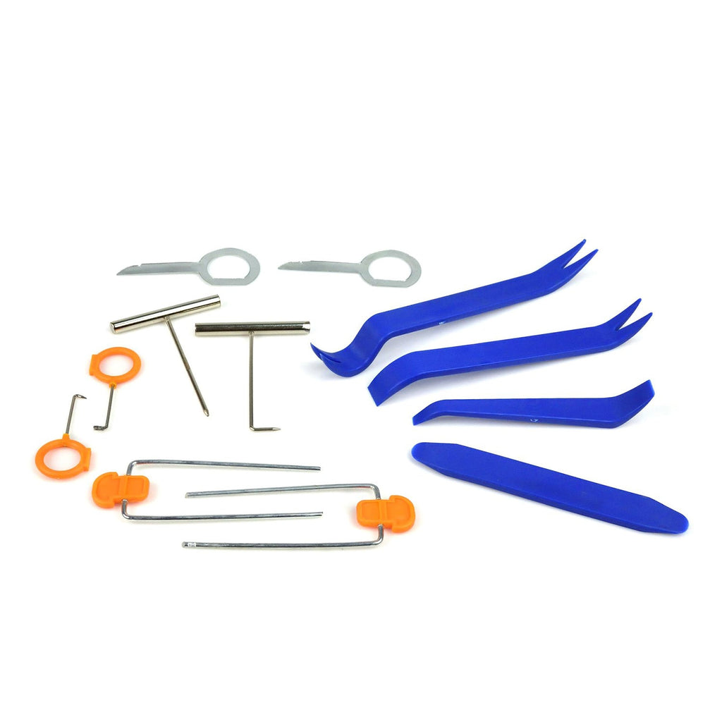 SADA NA DEMONTÁŽ AUTORÁDIA A ČALÚNENIA 12 KUSOV GEKO obsahuje sadu špachtlí a páčidiel na odstránenie čalúnenia a sadu na demontáž rádia a navigačného systému. Páčidlá sú vyrobené z odolného plastu na ochranu lakovaných povrchov pred poškriabaním.