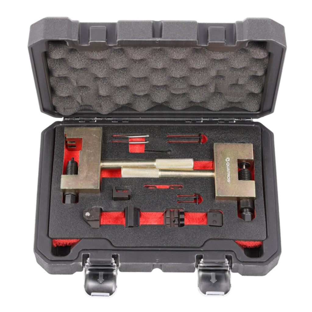 TÁTO SADA NA NITOVANIE ROZVODOVÉHO REŤAZA MERCEDES BENZ je kompletná sada špecializovaných nástrojov navrhnutých na uľahčenie montáže a demontáže jednoduchých a dvojitých rozvodových reťazí so skrutkami reťaze 4 mm.